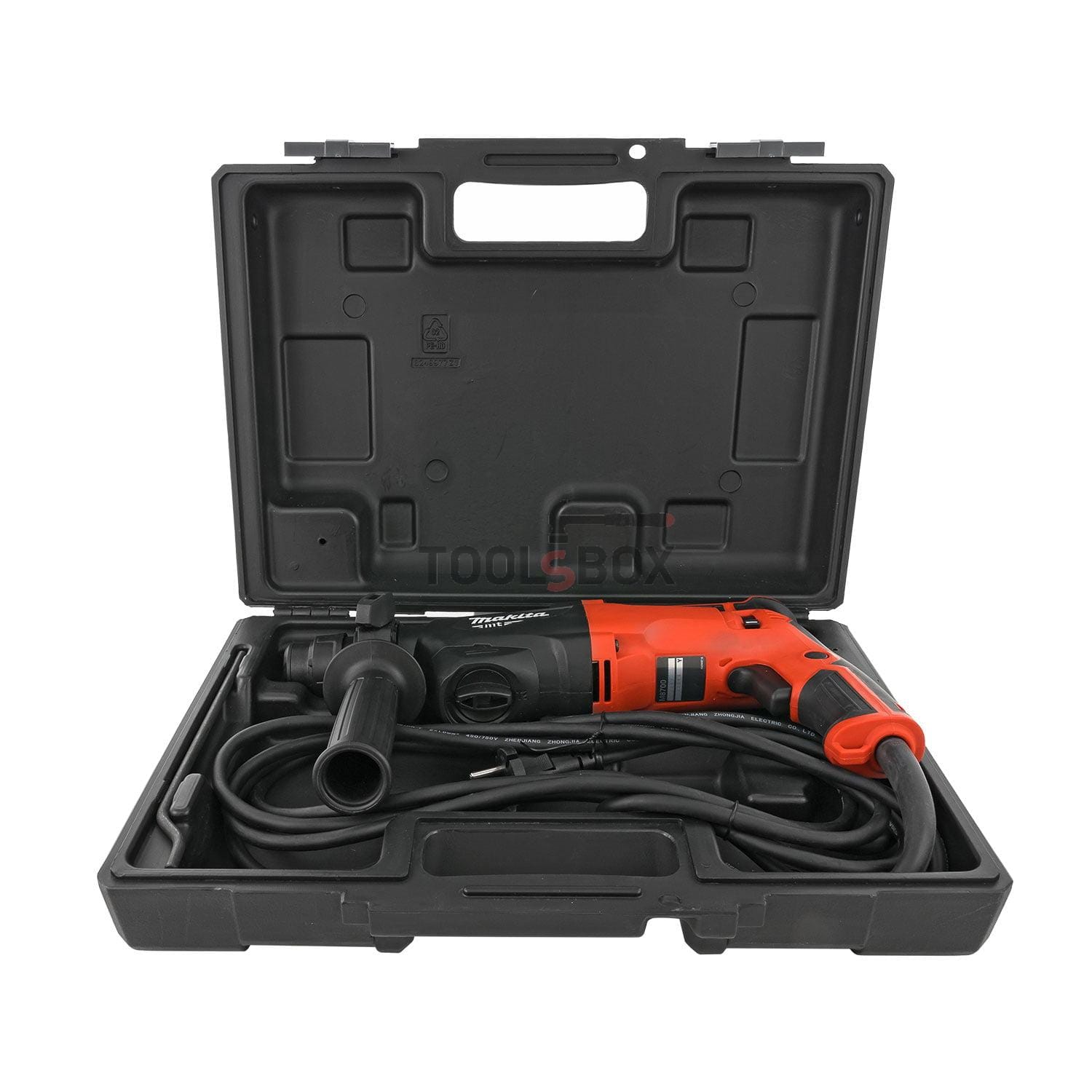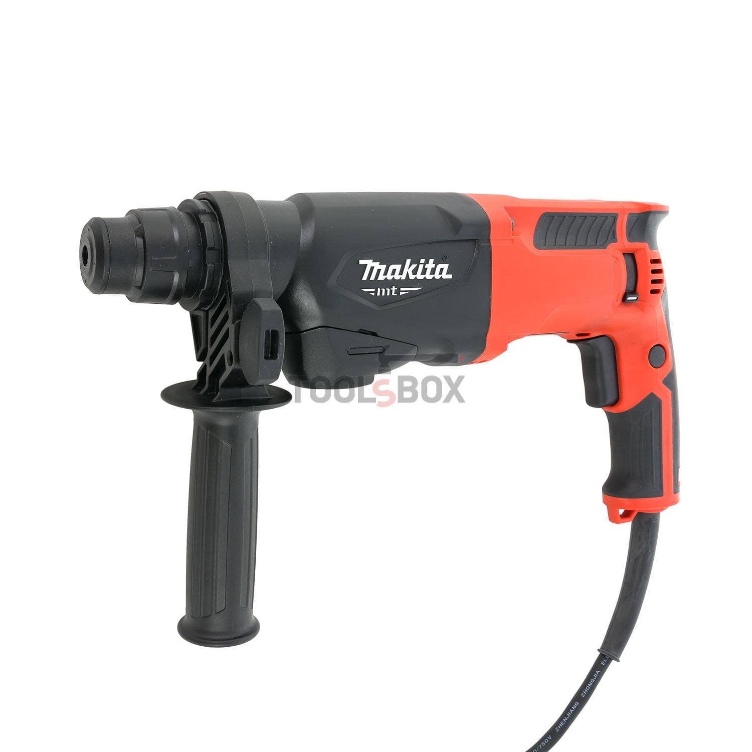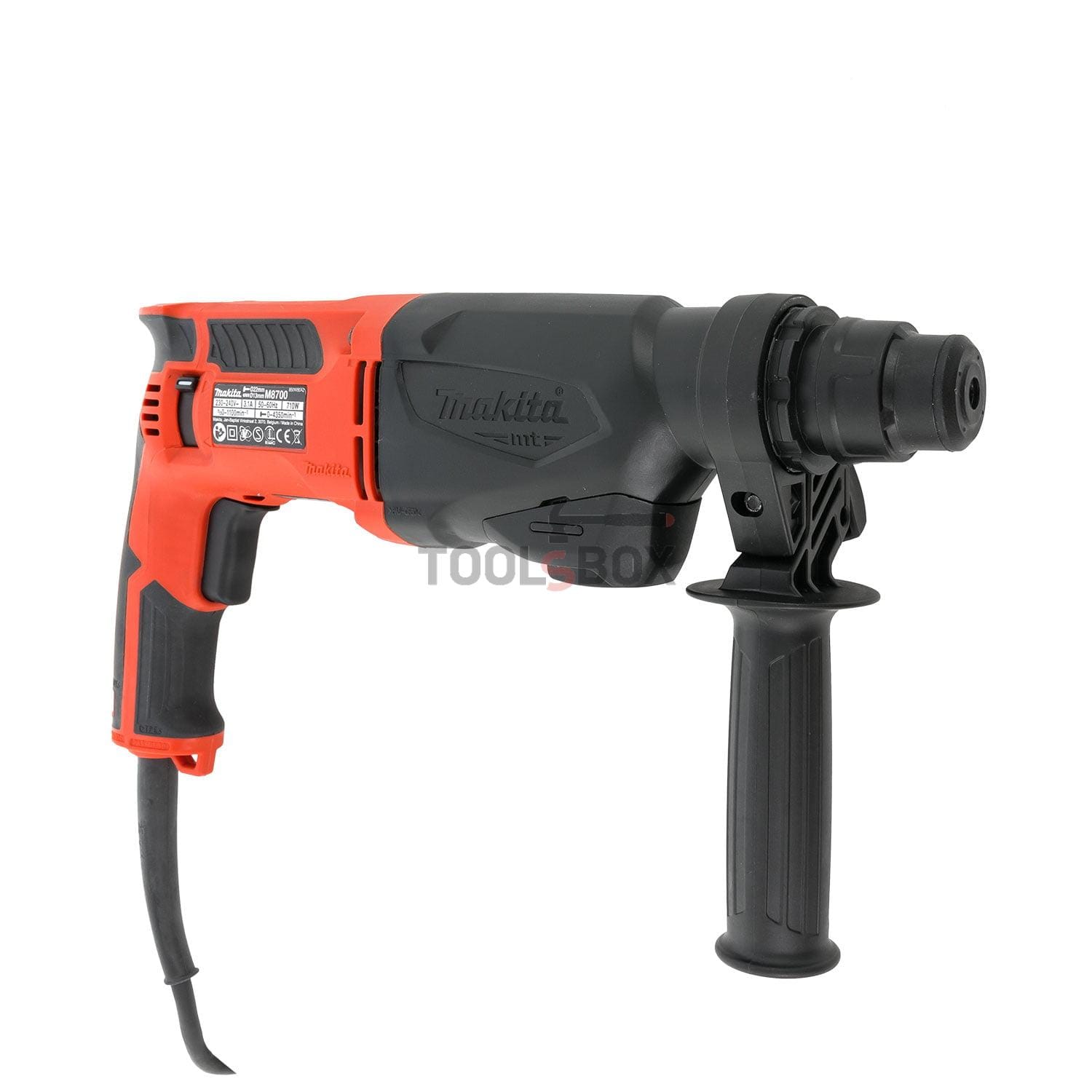 Електрическият перфоратор Makita MT M8700 , SDS Plus се използва за работа с бетон, стомана и дърво. Отличава се с бърза смяна на накрайниците без ключ и с отличното предаване на въртящия момент. При заклиняване на свредлото двигателят спира, което повишава безопасността на оператора и инструмента. Двойната изолация подобрява експлоатационните качества на перфоратора. Държачът на четките се върти, което осигурява един и същ въртящ момент при ляво и дясно въртене. Лостът на превключвателя на режима на работа – само пробиване и ударно пробиване, е изнесен в долната част на редукторната кутия, което предотвратява случайно превключване. Доставя се в куфар.