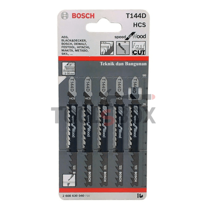 Страничен комплект шлифовани прободни триони от високоуглеродна стомана на Bosch. Байонетни остриета „T Shank“, подходящи за използване в повечето гори, включително иглолистна дървесина, ПДЧ, шперплат, както и плочи от влакна.