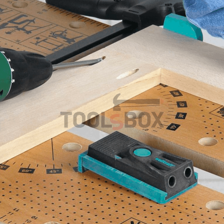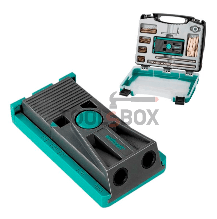 Шаблонът за отвори под ъгъл на WOLFCRAFT е незаменим помощник при изработването скрити винтови сглобки под герунг, ъглови, Т-образни или прави. Възможно е измерване на дебелината на дъската (12-30 мм) с линийката на шаблона и предварителна настройка за дебелината. Комплектът съдържа шаблон, стъпално свредло HSS, ф 9.5 мм, 180 мм, ограничител на дълбочината с ф 9.5 мм, шестостенен ключ SW 3, отвертка PZ 2 150 мм, 8 клина от сухо буково дърво за покриване на винтовите отвори, 8 винта за дърво 4×25 мм, 8 винта за дърво 4×30 мм, 8 винта за дърво 4×40 мм, 8 винта за дърво 4×60 мм. Доставя се в пластмасов куфар.