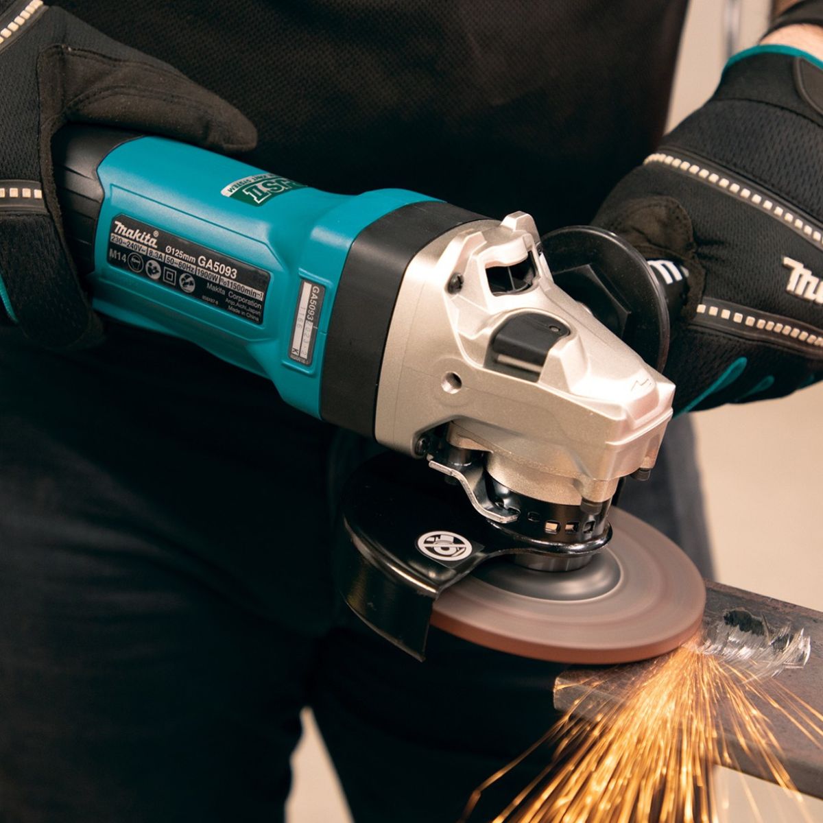 Ъглошлайф Makita GA5093X01 е надежден, високопроизводителен инструмент, с модул за плавен старт, който намалява първоначалния шок при стартиране, което осигурява по-добър контрол на инструмента, докато постига пълна мощност. Оборудван с високопроизводителен 1900 W мотор с променлива скорост, който е идеален за индустриални приложения. Работи с дискове с диаметър 125 мм и разполага със скорост без товар в диапазона от 2800 до 11 500 оборота в минута. Електрическият ъглошлайф е снабден с технологията AFT (Active Feedback sensing Technology), която предпазва потребителя от откат или заклинване на диска. Системата автоматично изключва машината, за да предотврати възникването на опасни ситуации. Разполага с Super Joint System II, което помага за намаляване на вибрациите и осигурява по-голяма защита на машината при натоварване. Гумираната странична ръкохватка допълнително подобрява комфорта и контрола по време на работа. С възможност за свързване към прахоуловител за по-чисто работно място.