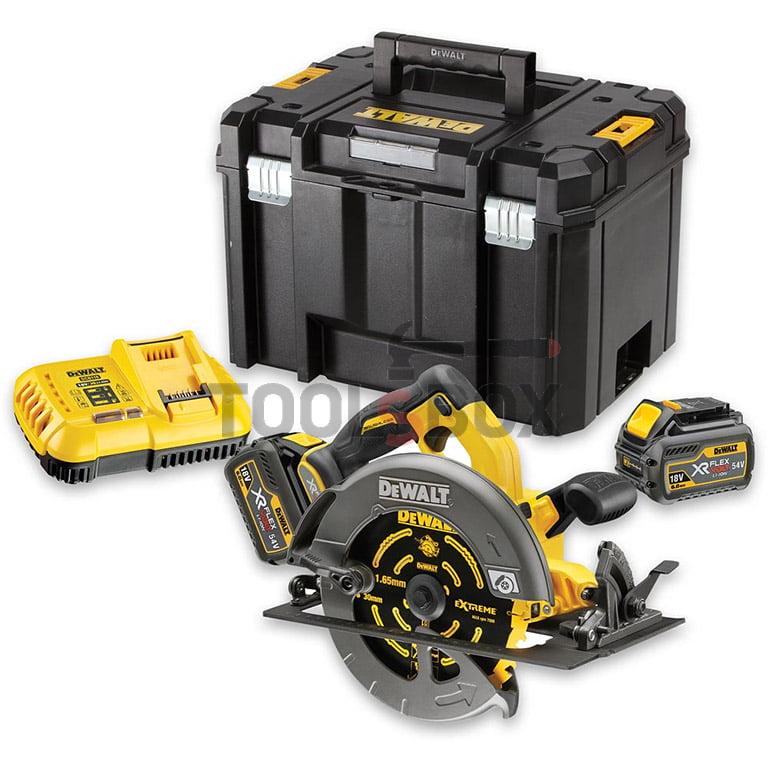 Мощен безчетков мотор с висок въртящ момент Flexvolt – не отстъпва на кабелния вариант.Диск 190 мм за всякакви строителни работи. Ръчния циркуляр Dewalt DCS576T2 XR Flexvolt работят с 54V, 6.0Ah батерия. Li-lon 18V батерии (2Ах, 3Ах. 4Ах, 5Ах не са съвместими с машините FLEXVOLT).