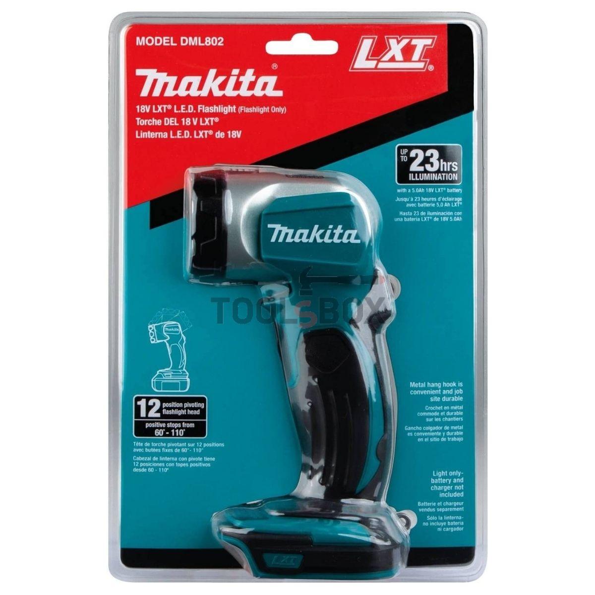 Фенерът DML802 на Makita има 3,2 W със 160 лумена светлинна мощност. Лампата има способността да се накланя в девет различни позиции, това прави неговото приложение изключително разнообразно. Съвместим е с батерии на Makita: BL1415 ; BL1430 ; BL1440 ; BL1815 ; BL1815N ; BL1830 ; BL1840