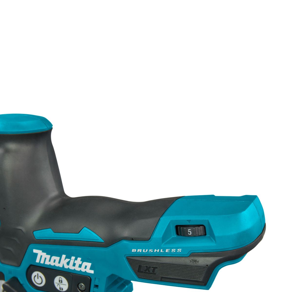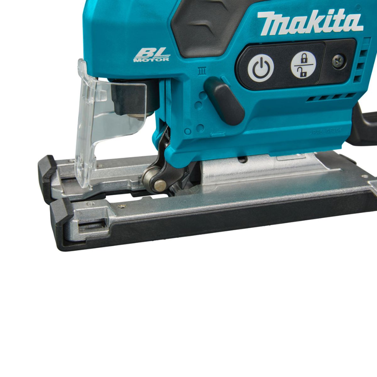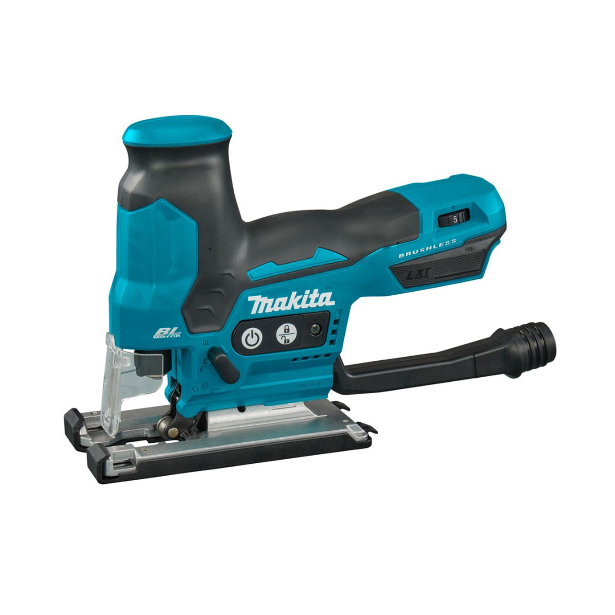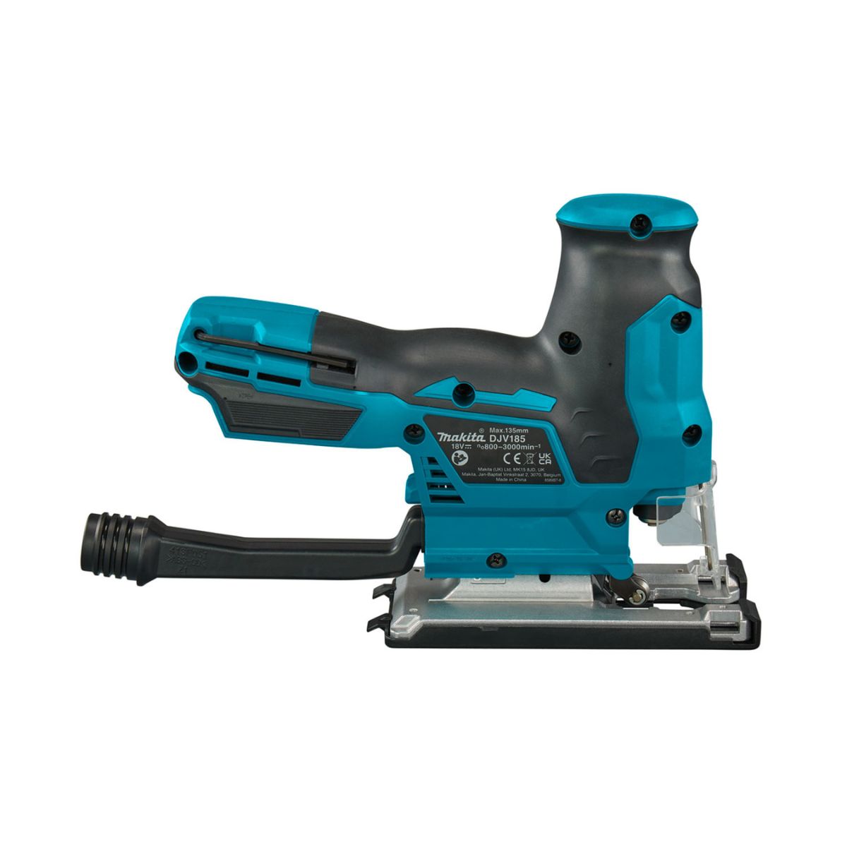 Акумулаторен прободен трион – зеге Makita DJV185Z е надежден и удобен инструмент, разполагащ с удобен механизъм за по-лесна и бърза смяна на ножа, без да се налага използването на допълнителни инструменти. Застопоряващият бутон позволява непрекъсната работа без постоянно натискане на превключвателя. Вградената светодиодна подсветка осигурява добра видимост на работната зона, особено в условия на слаба осветеност. Ергономичната ръкохватка с меко гумено покритие осигурява по-удобна работа и по-голям контрол върху инструмента. Със система за плавен старт, която намалява въртящия момент при включване на инструмента и ограничава пусковия ток. Системата за регулиране на оборотите позволява на потребителя да контролира скоростта на рязане в зависимост от нуждите и материала. Електрическата спирачка осигурява бързо спиране на движението на ножа при изключване на инструмента, което допълнително подобрява безопасността на работата. Трионът също така предлага възможност за свързване към прахоуловител, което помага за по-чиста работна среда.