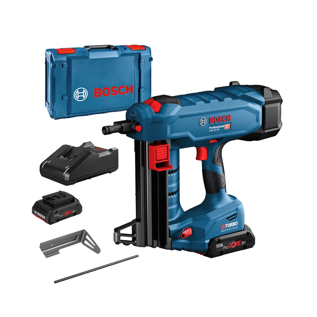Акумулаторен такер за бетон Bosch GNB 18V-38 е такер за гвоздеи с безчетков мотор Biturbo, захранван от 18 V батерия ProCore. Работи с пирони тип NB, NK и NM с диаметър 2.7-3 мм и дължина 16-38 мм (за бетон) или 13-19 мм (за стомана). Побира 22 пирона в магазина, осигурявайки ефективност и удобство при работа.
