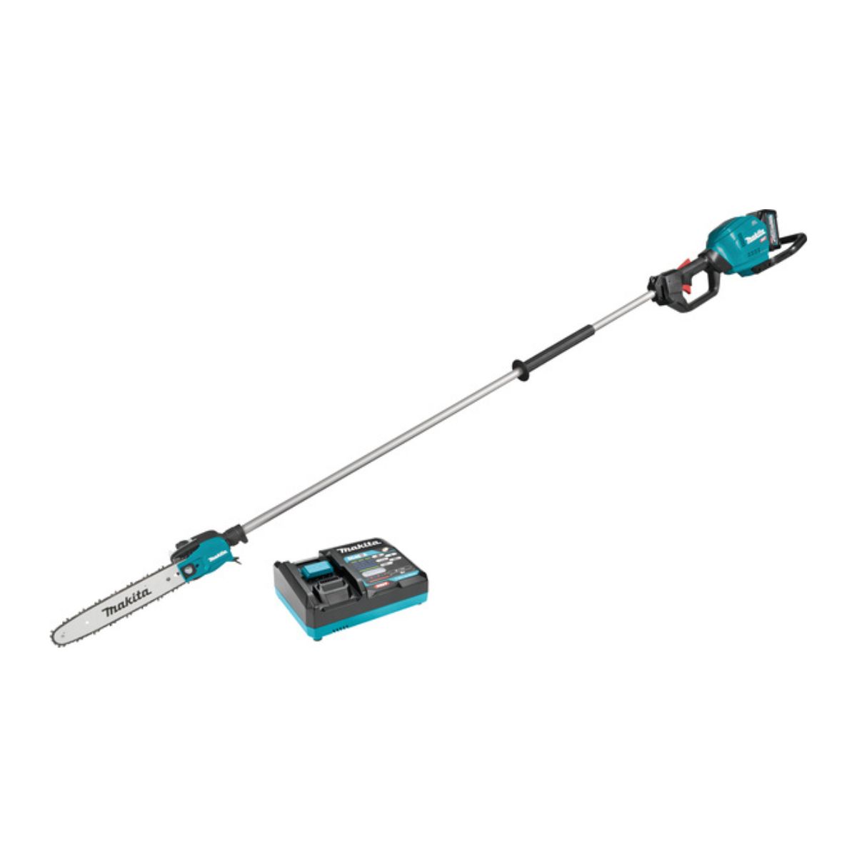Акумулаторен телескопичен трион Makita UA003GM101 е професионален верижен трион на прът, който ви позволява да режете високи клони безопасно от земята, без да се качвате на стълби. С обща дължина от 2.50 метра, този инструмент ви дава достъп до труднодостъпни места, като същевременно работи тихо благодарение на акумулаторното захранване, което е идеално за работа в жилищни райони или паркове. Прозрачният резервоар за масло позволява бърза визуална проверка на нивото без отваряне, така че винаги знаете кога е време за доливане. Специалният предпазител на зъбното колело идва с вградена гайка, която не може да се изгуби при поддръжка или смяна на веригата. Системата за автоматично смазване на веригата работи непрекъснато по време на рязане, като подава точното количество масло за гладка работа и по-дълъг живот на веригата и шината.