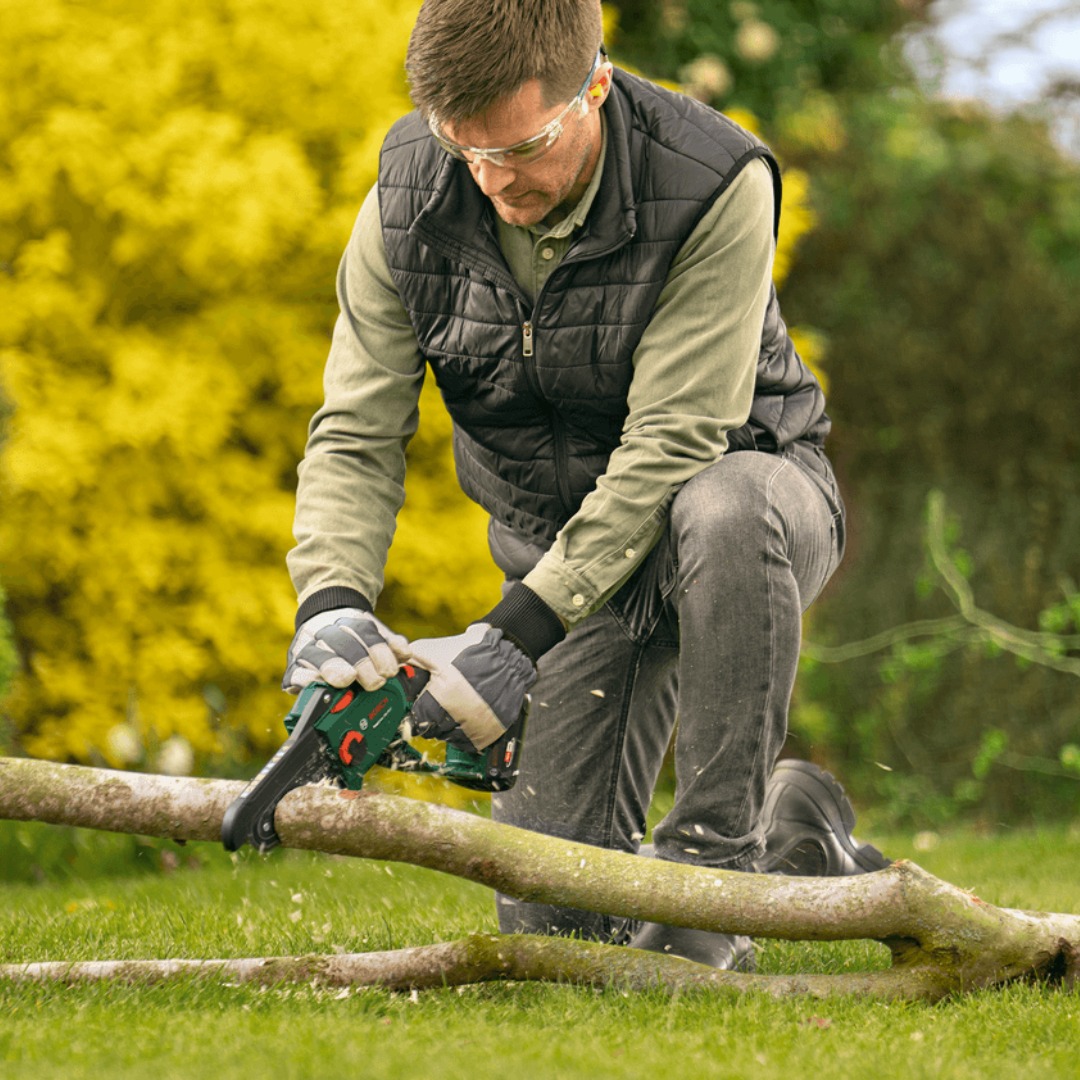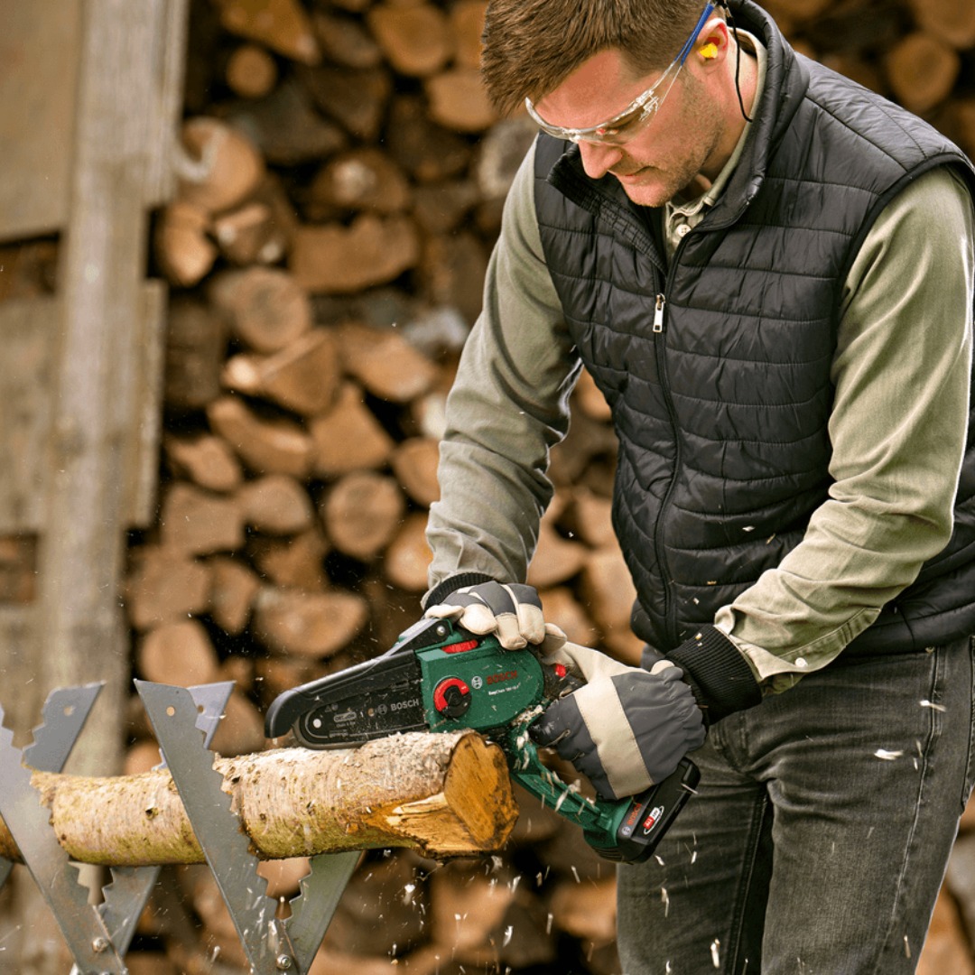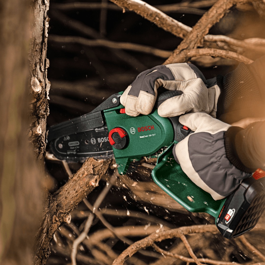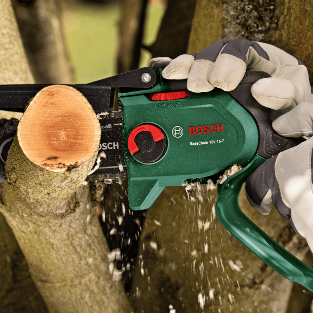 Акумулаторeн трион за клони Bosch EasyChain 18V-15-7 е компактен градински инструмент, предназначен за рязане, кастрене и поддръжка на по-дебели клони. Моделът работи с 18 V акумулатор от системата POWER FOR ALL ALLIANCE и е проектиран за удобно управление с ниско тегло, добър баланс и ергономични ръкохватки. Благодарение на безчетковия мотор и качествената верига Oregon, инструментът осигурява постоянна скорост на веригата 6.95 m/s и позволява обработка на дървесина с диаметър до 13 cm. Този модел е подходящ за потребители, които търсят лек и практичен трион за работа в двора и градината. Подготовката за работа е улеснена чрез SDS система за монтаж, опъване и смяна на веригата без нужда от допълнителни инструменти. Конструкцията е насочена към лесно преминаване между различни задачи по кастрене, а с акумулатор 2.5 Ah машината може да постигне до 160 среза в дърво с диаметър 50 mm при едно зареждане.