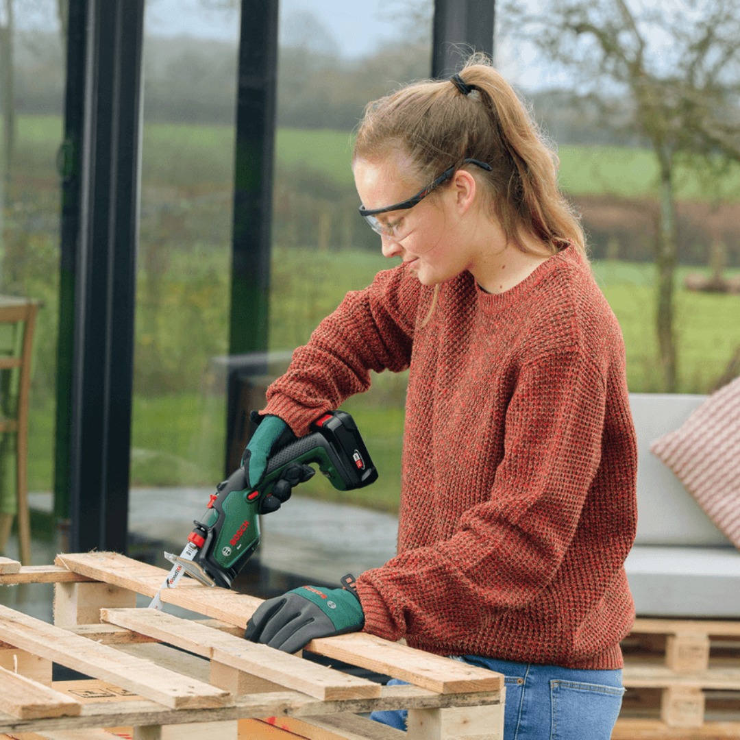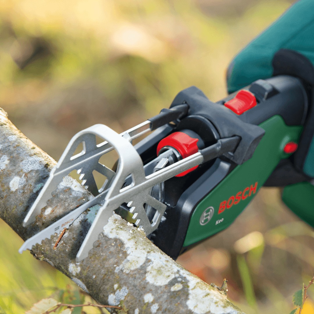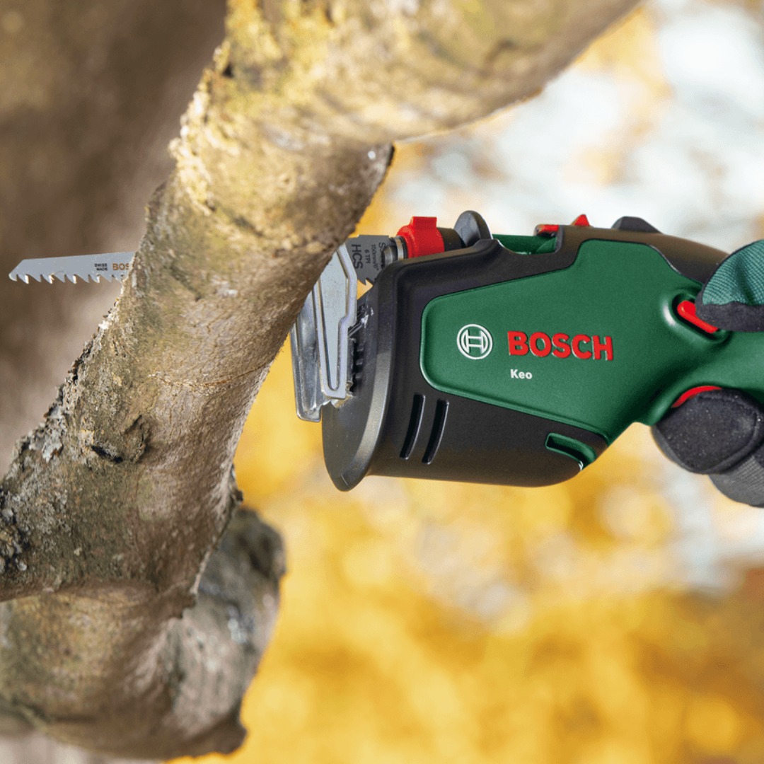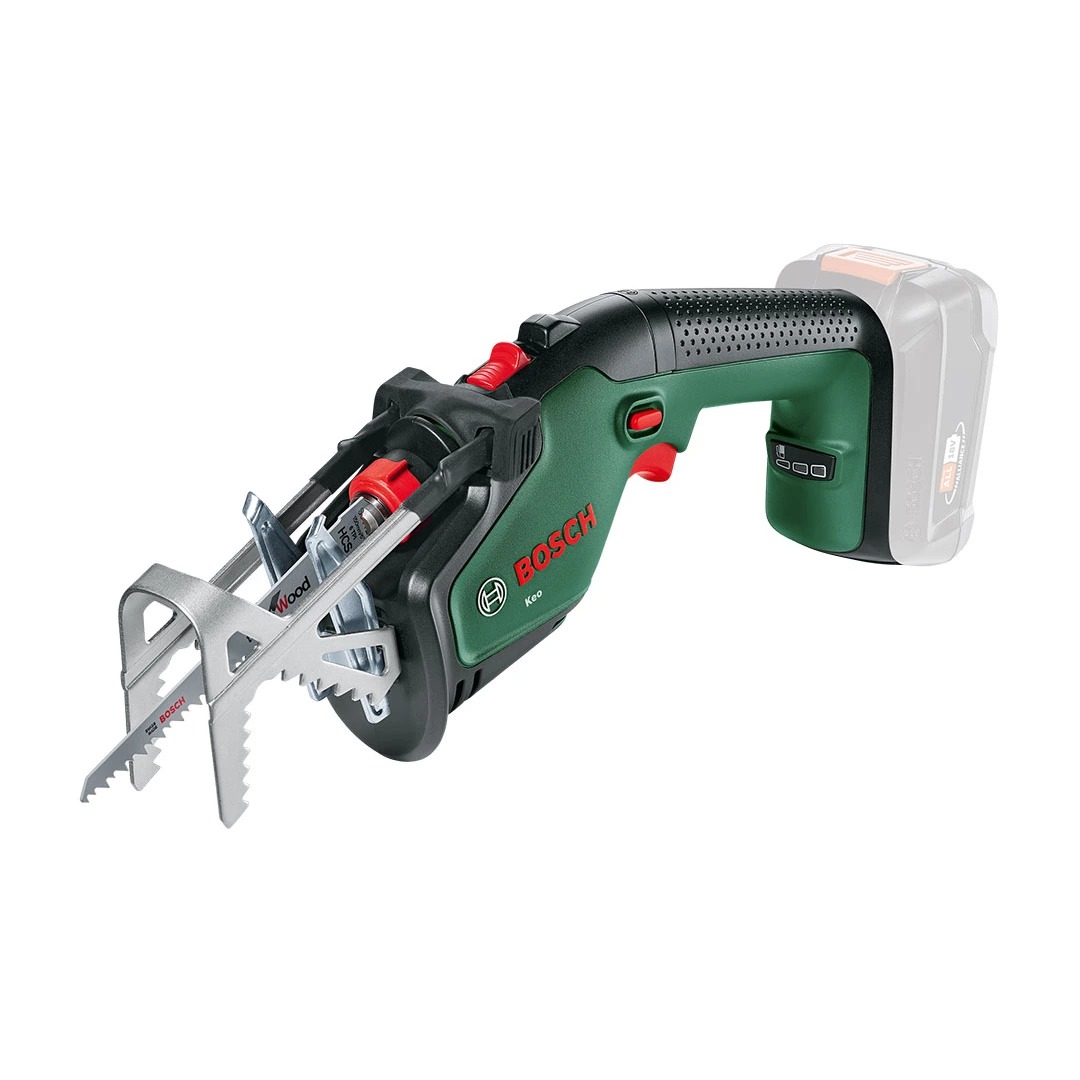 Акумулаторен трион за клони Bosch KEO 18V, предназначен за удобно рязане на клони и храсти с работа с една ръка. Моделът е част от системата 18V POWER FOR ALL ALLIANCE и се доставя без батерия и без зарядно устройство. Конструкцията е създадена за по-лесен контрол при работа, а сменяемите ножове разширяват приложението му и за различни задачи около дома и градината. Инструментът разполага с подвижен държач A-Grip, който подпомага стабилното задържане на клона по време на рязане. Без този държач капацитетът на рязане достига до 80 mm, а с него – до 60 mm. Острието е с дължина 150 mm, а честотата на ходовете на празен ход е от 0 до 2300 хода в минута, което позволява ефективна работа при подрязване на дървесни материали. Моделът е подходящ за домашна употреба и за поддръжка на градината, когато е необходим компактен и лек инструмент за подрязване. Плавният старт подпомага контрола при започване на рязане, а енергийното управление е оптимизирано за добра ефективност и продължителност на работа според използваната батерия.