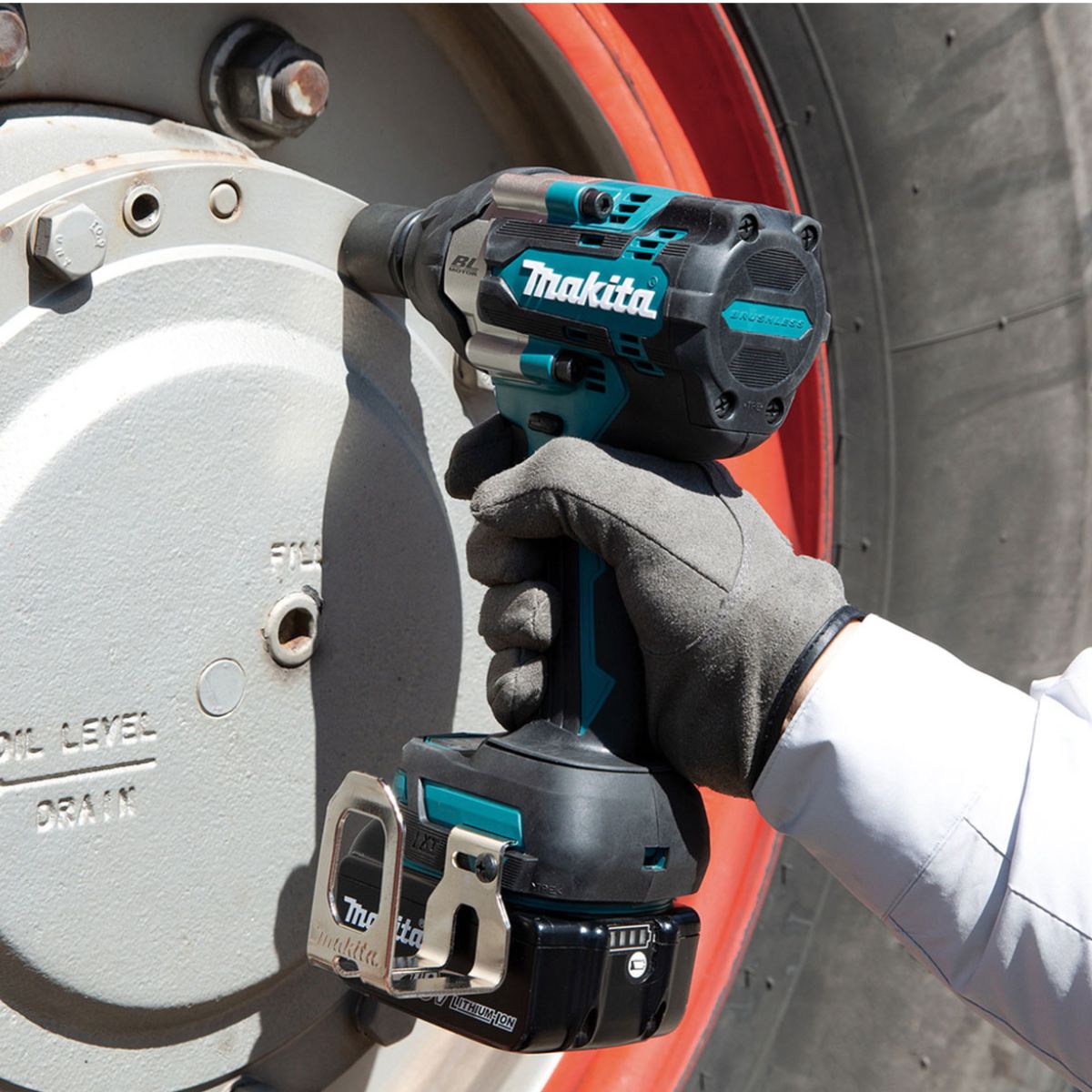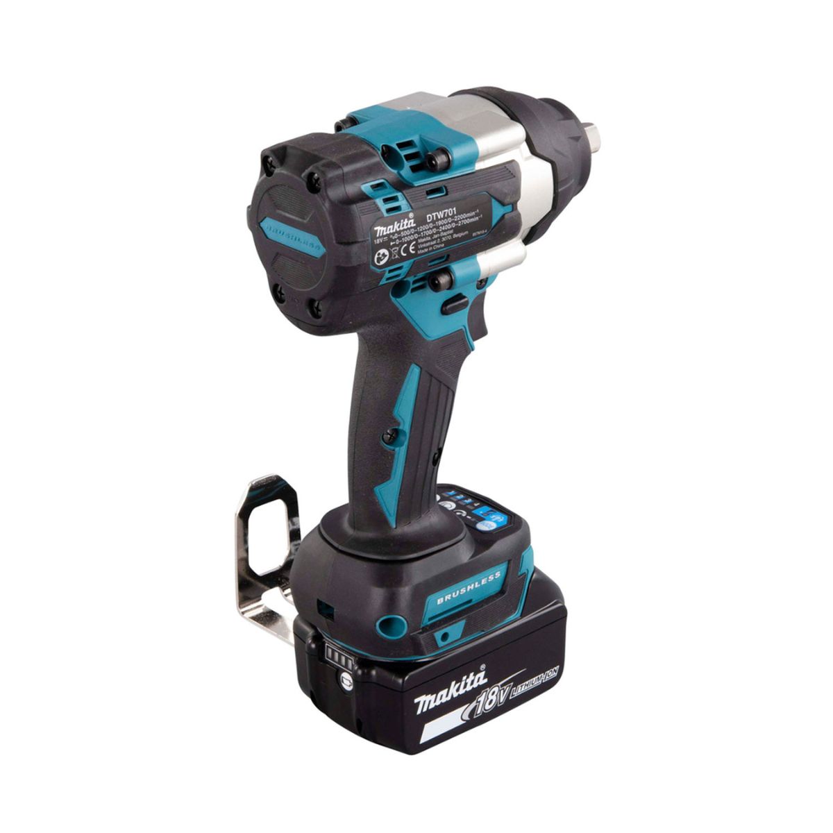 Акумулаторен ударен гайковерт Makita DTW701RTJ е мощен и компактен инструмент, оборудван с безчетков двигател, който осигурява висока ефективност и дълъг живот на батерията. Има висок въртящ момент от 700 Nm, което му позволява да се справя със задачи, изискващи голяма сила. С компактния си размер от само 170 мм, той е удобен за работа в тесни и ограничени пространства. Разполага с 4-скоростен електронен превключвател, който позволява на потребителя да избира подходящата скорост за всяка задача. Режимът за автоматично спиране с обратно завъртане е особено полезен, като спира удара и въртенето само за 0,2 секунди след разхлабването на болта или гайката. Оборудван с удобна LED подсветка, която осигурява ясно осветление на работната област. Има 6 ротационни режима на работа – 3 напред и 3 назад, които предоставят гъвкавост и удобство при работа с различни материали и задачи. Ергономичната ръкохватка с меко гумено покритие осигурява по-удобна работа и по-голям контрол върху инструмента.