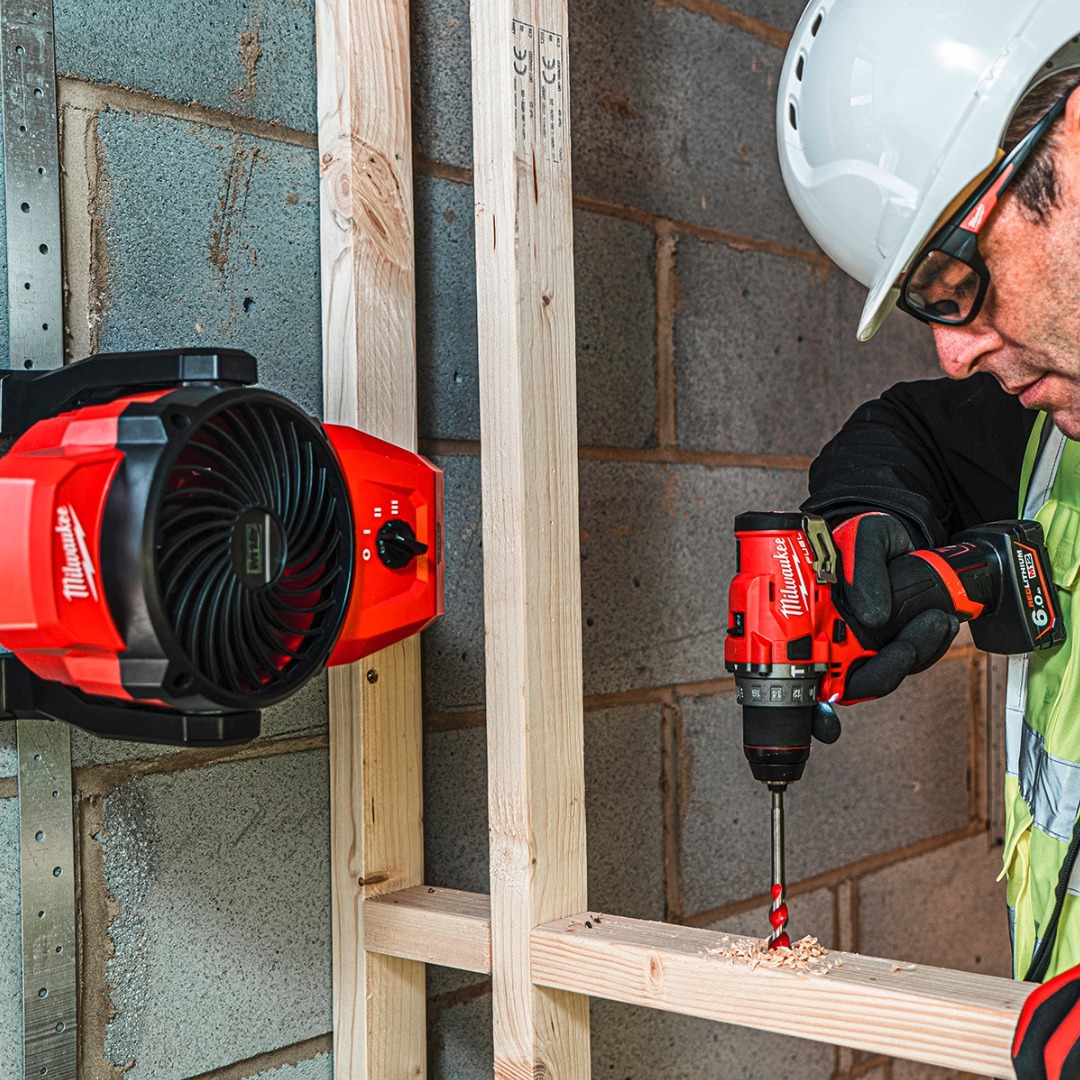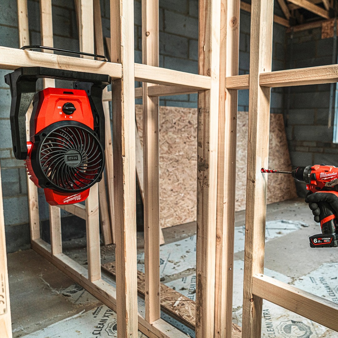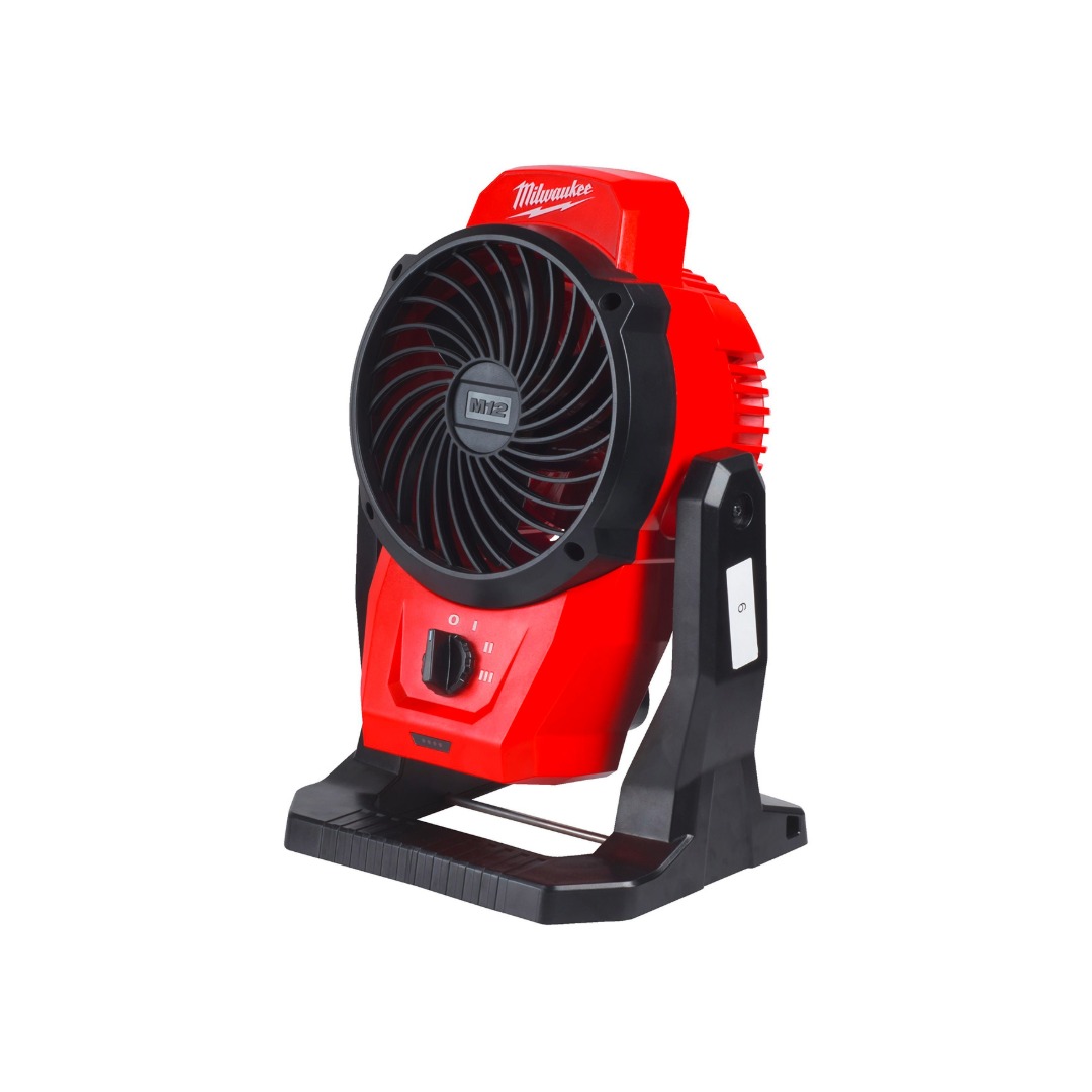 Акумулаторен вентилатор Milwaukee M12AF-0 е лек и компактен, подходящ за работа в тесни пространства. Разполага с три степени на въздушен поток, като максималната скорост достига 375.5 м/мин (22.53 км/ч). Перката с диаметър 150 мм осигурява въздушен обем до 680 м³/ч. Посоката на въздушната струя се регулира неограничено, а 360° завъртане гарантира пълен контрол. Вентилаторът има интегрирани магнити, стойка, метална кука и отвори за различни варианти на монтаж. С батерия M12 REDLITHIUM 3.0 Ah (не е включена) осигурява до 2 часа работа на максимална мощност. Съвместим е с всички батерии от серията M12 на MILWAUKEE.