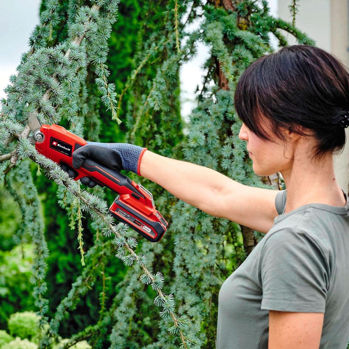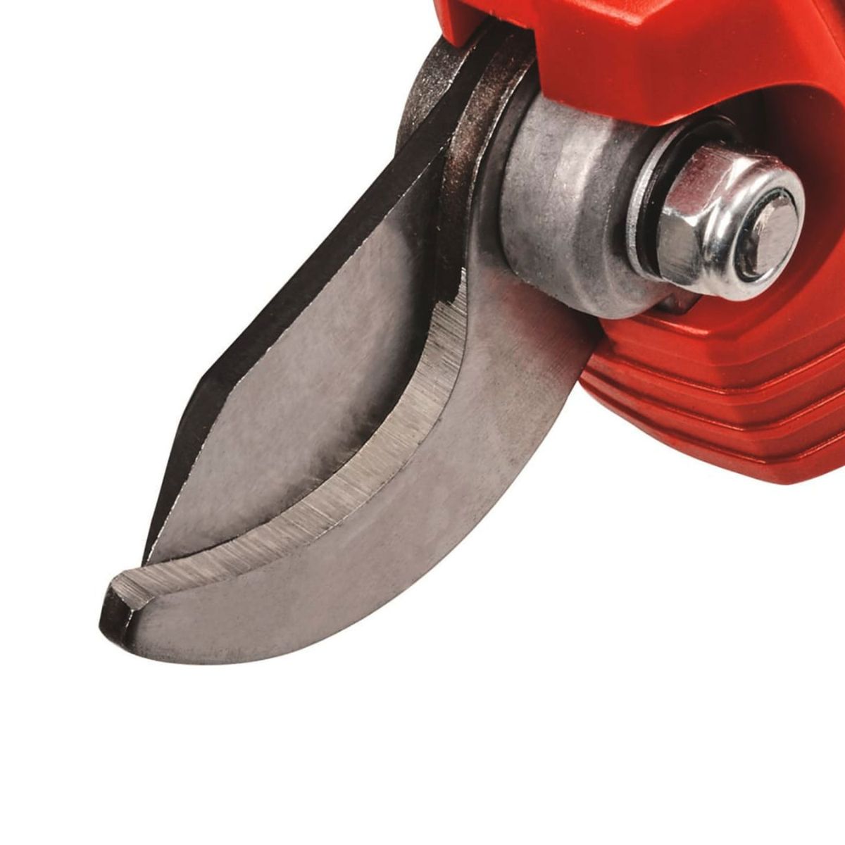 Акумулаторна градинска ножица Einhell GE-LS 18 Li – Solo е идеална за рязане на клони с дебелина до 28 милиметра. Представлява отличен помощник за поддръжка на градината, особено при извършване на грижи, които изискват рязане на повече от няколко клонки. Ножовете са висококачествени, предназначени за ефективно и прецизно рязане, като гарантират точен и чист разрез, който спомага за здравословния растеж на растенията. Острието е лесно за смяна, а устройството разполага с ергономична дръжка с мек захват, осигуряваща комфорт по време на употреба. За безопасно съхранение в затворено положение, ножиците разполагат с плъзгащ се превключвател за включване и изключване, което ги активира или деактивира. Щипката за колан предоставя оптимален комфорт, дори при работа на по-високи позиции на дървото. Със стабилен пластмасов капак на острието, за да се осигури безопасно съхранение.