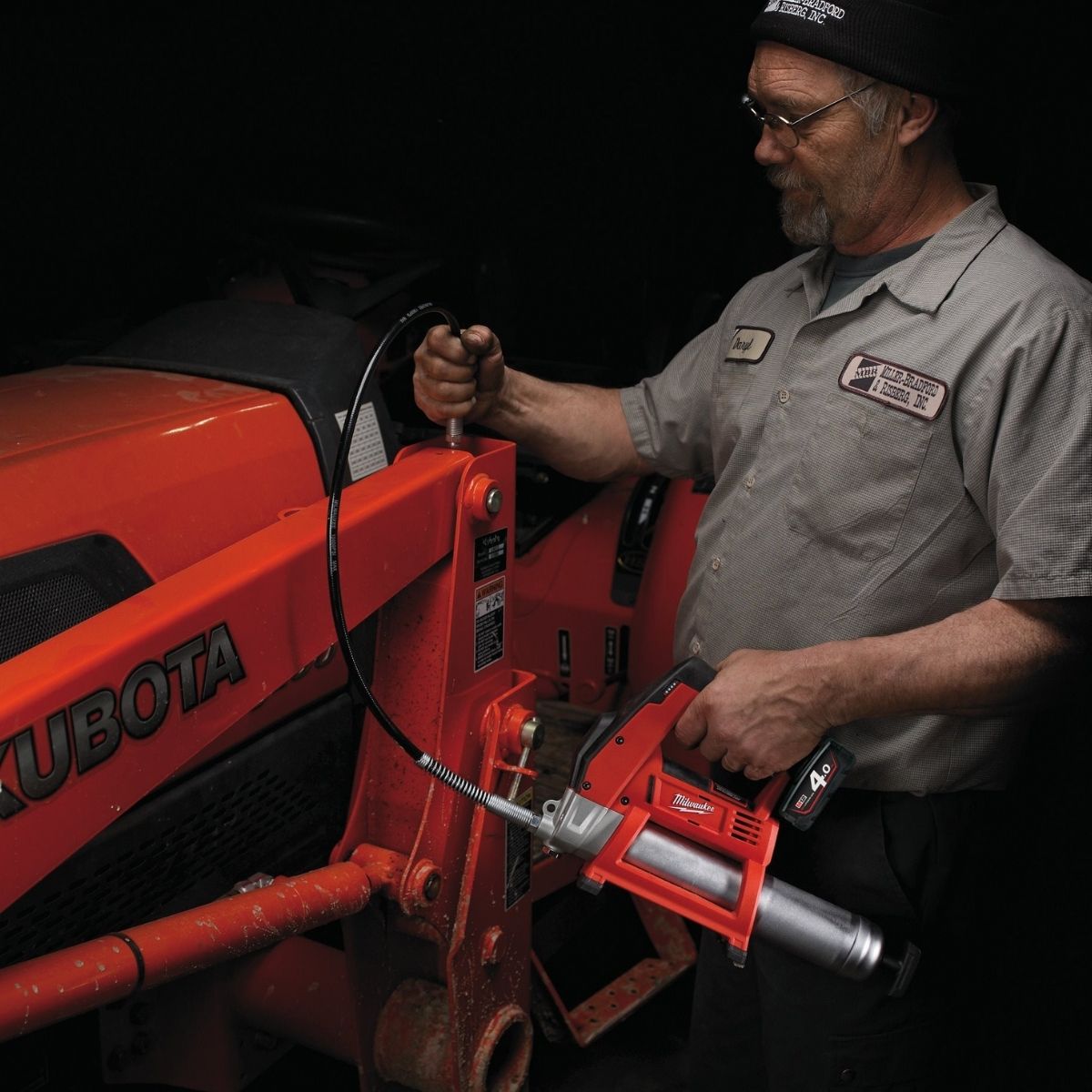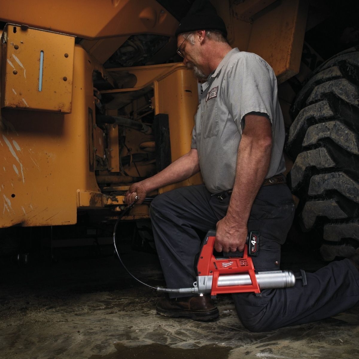 Акумулаторна гресьорка Milwaukee M12GG-0 е мощен и удобен инструмент за бързо и чисто нанасяне на грес и масла. Захранвана от 12 V мотор, тя осигурява впечатляващо максимално налягане от 562 bar, което позволява ефективно смазване дори на труднодостъпни и силно натоварени механизми. Вградената система за защита от претоварване REDLINK предпазва двигателя и батерията, като удължава експлоатационния им живот. Дозирането на смазката става прецизно чрез натискане на бутон, което предотвратява разливането и излишната консумация. Гресьорката работи с патрон от 400 мл или 473 мл насипно състояние, а огромното налягане гарантира пълно извличане на съдържанието. Оборудвана е с гъвкав маркуч за високо налягане с предпазител на пружината и мазнинен съединител, с дължина 914 мм, осигуряващ лесен достъп до всяка точка за смазване. Този модел е идеален за професионални механици и сервизи, където скоростта, чистотата и ефективността на работа са от решаващо значение.