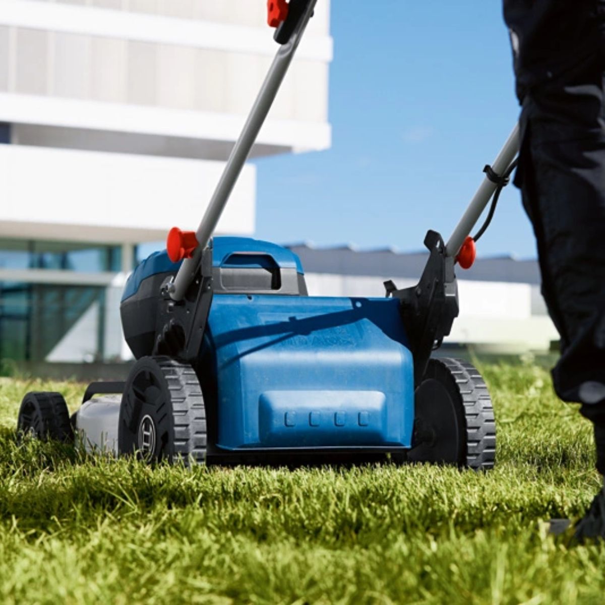 Акумулаторна косачка Bosch GRA 18V2-46 е снабдена с безчетков мотор, който осигурява мощна производителност и по-дълъг експлоатационен живот. Тя работи с две 18 V акумулаторни батерии, което осигурява увеличено време на работа и е подходящо за по-големи площи. Косачката е подходяща както за косене и събиране на трева, така и за мулчиране, което представлява опция за екологично почистване на тревната повърхност. Ширината на косене е 46 см, като височината на косене може да се регулира лесно на 6 нива от 30 до 70 мм, за да отговори на различните изисквания за подрязване. Ръкохватката има 2-степенно регулиране на височината, което осигурява комфорт и удобство по време на работа. Конструкцията на косачката е изключително здрава, с изцяло метален капак, което я прави подходяща за интензивна употреба.