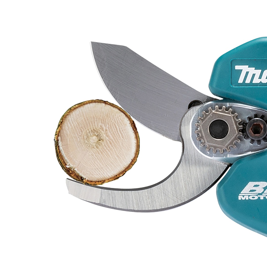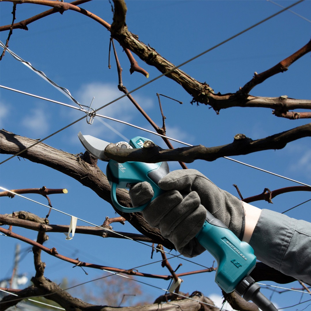 Акумулаторна лозарска ножица Makita DUP180Z е лек и удобен инструмент, създаден за effortless рязане на клони с диаметър до 30 mm. Ножицата е проектирана както за дясна, така и за лява ръка, а ергономичният колан за батериите осигурява комфорт при продължителна работа. Подходяща е за употреба в среди, чувствителни към шум, което я прави отличен избор за професионална резитба в населени или затворени пространства. За по-висока безопасност остриетата се отключват само след натискане и задържане на превключвателя след включване на машината. Ножицата позволява регулиране на ъгъла на отваряне на острието, което улеснява серийното рязане на по-тънки клони и повишава ефективността при повтарящи се операции. Работи с 18 V батерия Makita (продава се отделно), осигурявайки мобилност, надеждност и висок професионален стандарт при резитбата.