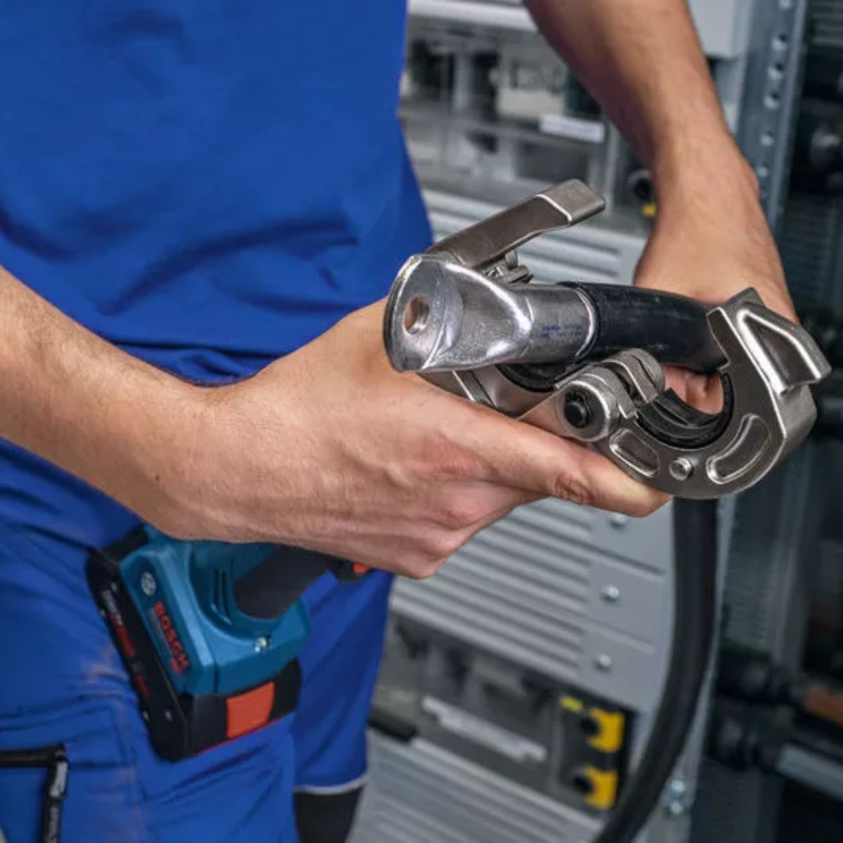 Акумулаторна машина за кримпване Bosch GPH 18V-60 е предназначен за кримпване на кабелни накрайници върху медни и алуминиеви кабели. Със своята постоянна изходна сила от 60 kN и вграден електронен сензор за налягане, той гарантира надеждни и качествени резултати при всяко приложение. LED индикаторът осигурява удобна визуализация на постигнатото налягане, състоянието на инструмента и необходимостта от поддръжка. Благодарение на функцията за ръчно освобождаване на налягането, кримпването може да бъде прекъснато по всяко време за допълнителен контрол и безопасност. Инструментът е подходящ за кримпване на кабели с напречно сечение до 300 mm², което го прави универсално решение за електротехници и професионалисти в индустрията. Вградената USB връзка и специализиран софтуер предоставят възможност за проследяване на историята на кримпване, диагностиката на грешки и планирането на поддръжка, като допринасят за по-дълъг експлоатационен живот и оптимална ефективност.