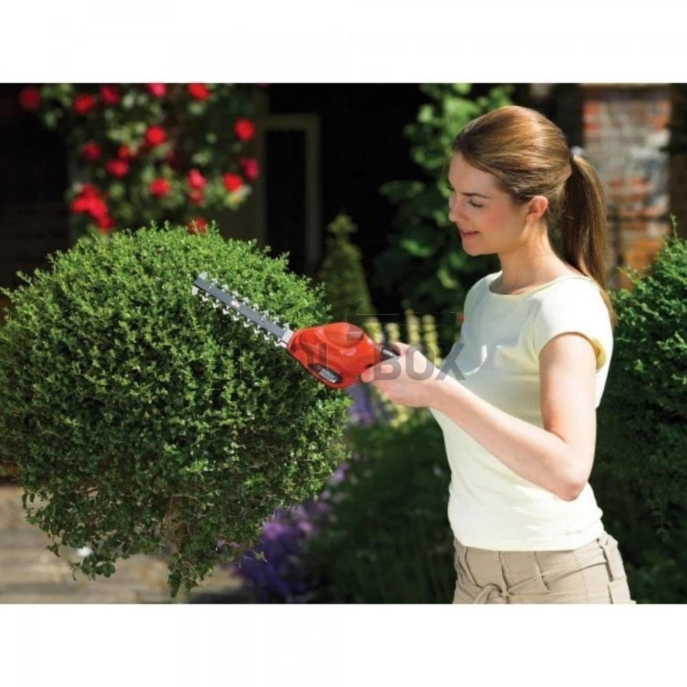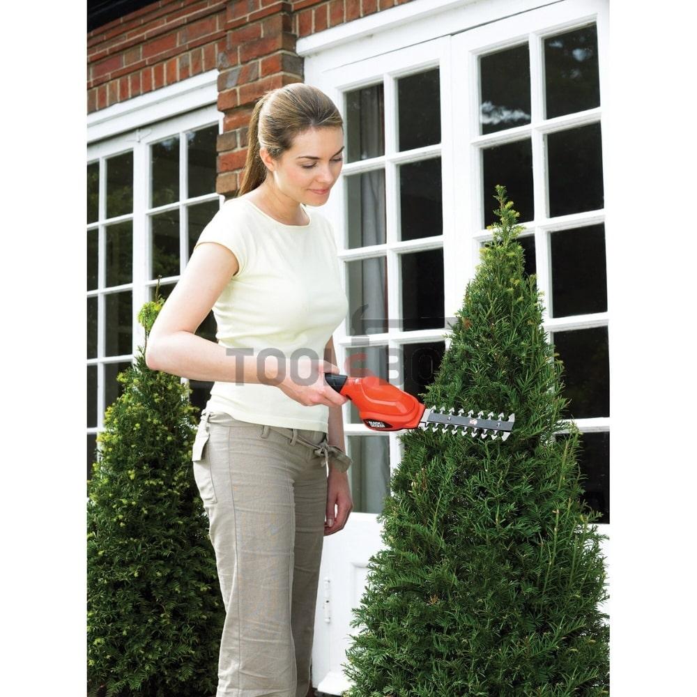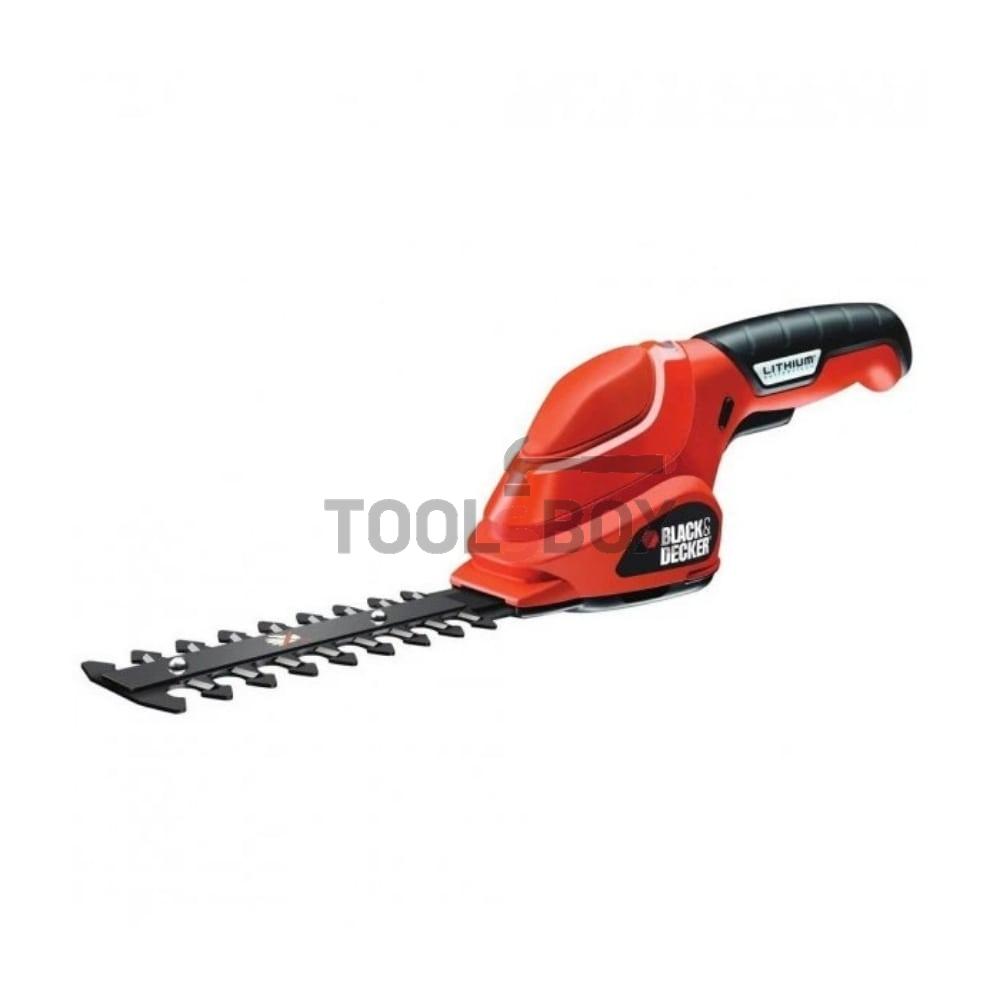Акумулаторна ножица Black&Decker GSL700 / 7 V за подрязване на жив плет, малки храсти и трева. Има сменяеми остриета за бързо и лесно преминаване от режим подрязване в режим оформяне на краищата. Инструментът е лек и лесен за използване, с акумулаторна батерия, не се използва кабел по време на работа. Стойка и отделно зарядно устройство за лесно зареждане.