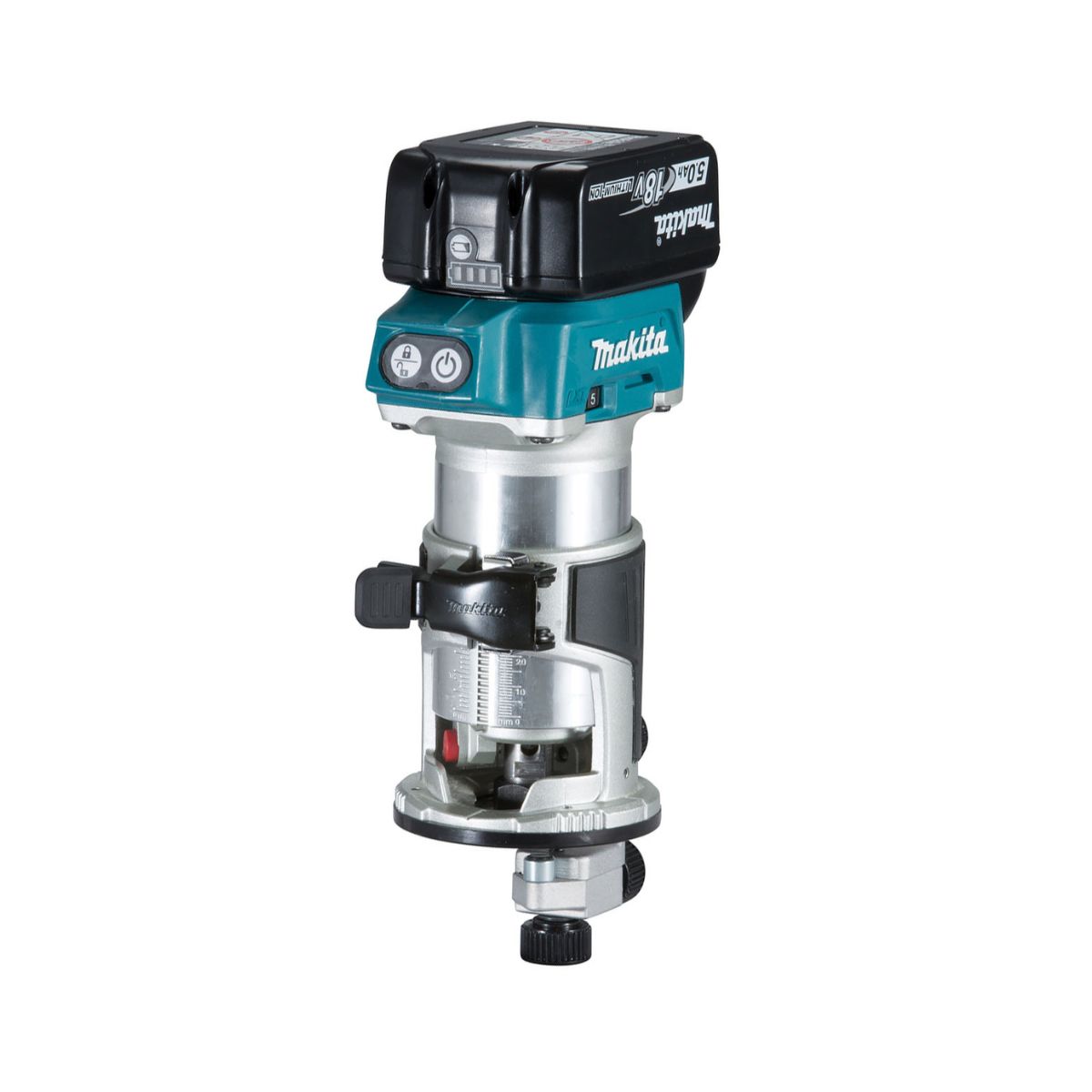 Акумулаторна оберфреза Makita DRT50RTEX3 има ефективен безчетков мотор Makita BL за до 50% по-дълго време на работа, повишена мощност и скорост и по-дълъг живот на инструмента. Той е проектиран за пълна гама от дървообработващи приложения. С функция за плавен старт за по-плавно стартиране и по-добра точност. Функциите за удобство включват плавна система за фино регулиране на дълбочинатана рязана до 3 степени за по-прецизни настройки, двойни LED светлини за осветяване на работната повърхност и система за бързо освобождаване на камерата за удобно регулиране на дълбочината и премахване/монтиране на основата. Заключване на вала – лесна инсталация и отстраняване на тримерен бит с единичен ключ, чрез натискане на ключалката на вала.