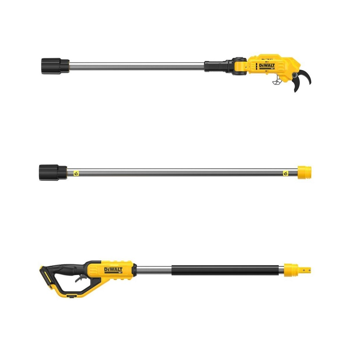 Акумулаторна телескопична ножица DeWALT DCMPP569N е телескопична версия на добре познатата ръчна ножица на марката, създадена за удобно подрязване на високи или труднодостъпни клони. Благодарение на сгъваемата конструкция се съхранява лесно, а леката алуминиева дръжка осигурява комфорт при продължителна работа. Инструментът разполага със 7-позиционна шарнирна глава, която позволява лесна настройка на ъгъла според конкретната задача. Остриетата са с незалепващо покритие за по-гладки срезове и по-малко съпротивление, а вградената метална кука помага при премахване на заседнали клони. За допълнително удобство е предвиден и резервен нож (модел DCMPPRB1-QZ).