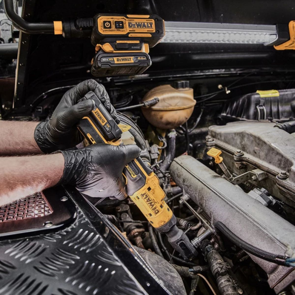 Акумулаторна тресчотка DeWALT DCF500L2G представлява отлично решение за нуждите на автомобилната и строителната индустрия. Тя разполага с безчетков мотор, който работи на 12 V батерия и достига максимална скорост от 450 оборота в минута, като осигурява въртящ момент на затягане от 75 Nm. С три адаптера, този инструмент позволява работа със съединителни размери квадрат 1/4″ и 3/8″, както и шестостен 1/4″. Главата е със запечатана конструкция, а корпусът е изработен от подсилена със стъклопластмаса, което не само увеличава цялостната й здравина, но и я предпазва от влиянието на автомобилни масла и разтворители. Вградената LED светлина осигурява осветеност на работната зона, особено в условия на недостатъчно осветление.