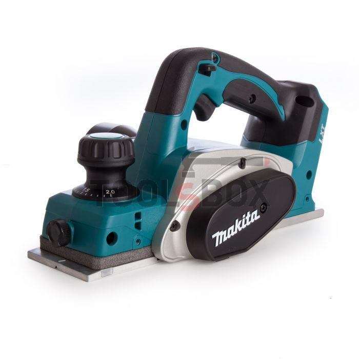 Ренде Makita DKP180Z Копчето за регулиране на дълбочината на рендосване има удобна скала с деления на всеки 0,10 мм и противоплъзгащо еластомерно покритие, осигуряващо по-надежден и удобен захват по време на работа с инструмента. Здравата скоба от лят алуминий осигурява по-дълъг срок на експлоатация на барабанния вал. Опорната плоча защитава обработваната повърхност и ножовете от надраскване и повреди, дори ако инструментът се поставя върху обработваната повърхност преди пълното спиране на барабана. Електрическата спирачка плавно спира въртенето на диска. Ергономичната удобна ръкохватка с противоплъзгащо гумено покритие осигурява по-голямо удобство и по-висока ефективност при работа с инструмента. Накрайник за прахосмукачка / торбичка за прах. Наличие на V-образен канал. Без зарядно и батерия.