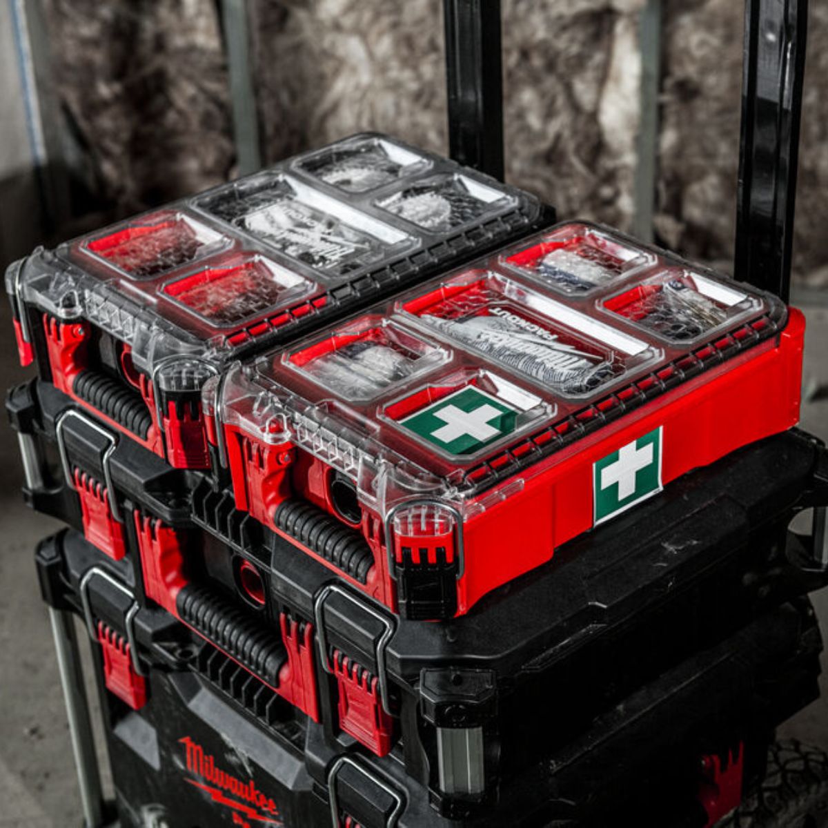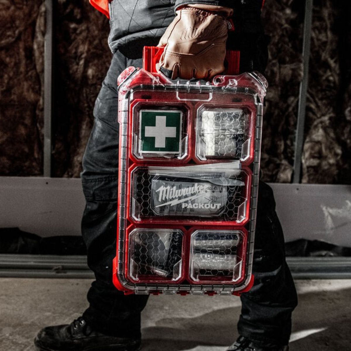 Аптечка Milwaukee Packout DIN 13157 е изработена специално за работната площадка, удароустойчива и издръжлива. С най-важните принадлежности при спешни случаи. Защита от атмосферни влияния с рейтинг IP65 за предпазване от дъжд и отломки от работната площадка. Разполага с 5 подвижни отделения, които са уплътнени, за да предотвратят разместването при транспортиране.