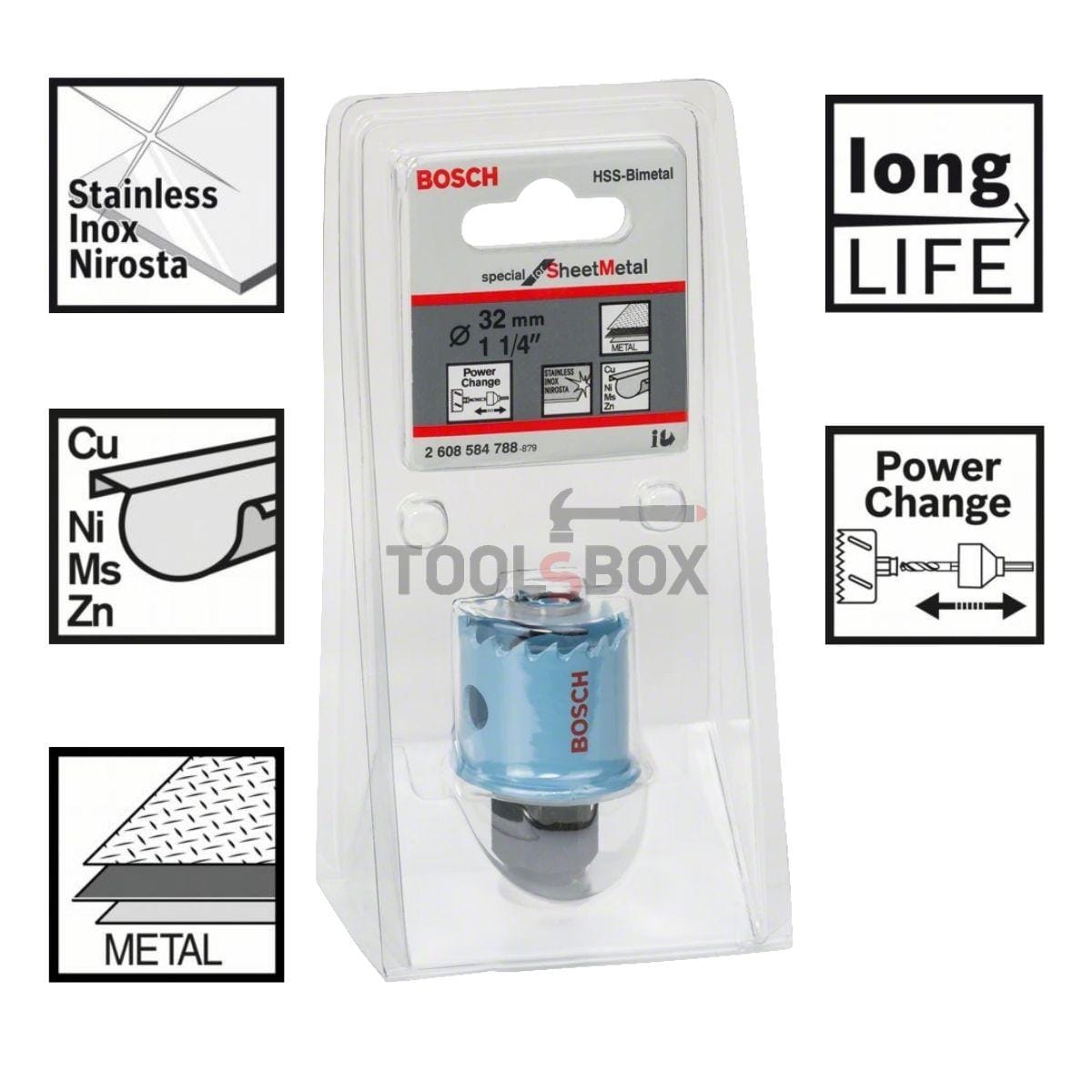 Биметалната боркорона на BOSCH Special for Sheet Metal е специално създадени за пробиване в метали – тънка стоманена ламарина, включително неръждаема, мед, месинг или бронз. Изработена от HSS стомана с 8% кобалт. Зъби с променлива геометрия, която осигурява бързо и чисто, плавно и без вибрации рязане на материала. В задния край на боркороната има изпъкнал ръб, който не й позволява да хлътне в отвора след прорязване на ламарината. Препоръчителни скорости на рязане: Инокс: 85 об./мин.; Ламарина: 170 об./мин.; Цветни метали: 230 об./мин.