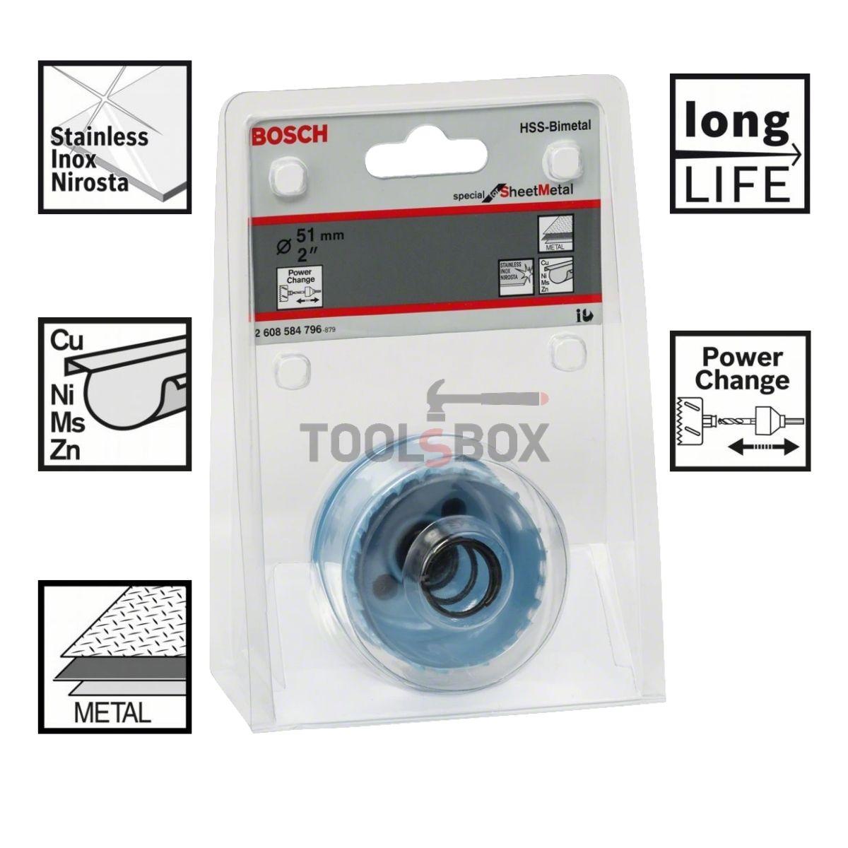 Биметалната боркорона на BOSCH Special for Sheet Metal е специално създадени за пробиване в метали – тънка стоманена ламарина, включително неръждаема, мед, месинг или бронз. Изработена от HSS стомана с 8% кобалт. Зъби с променлива геометрия, която осигурява бързо и чисто, плавно и без вибрации рязане на материала. В задния край на боркороната има изпъкнал ръб, който не й позволява да хлътне в отвора след прорязване на ламарината. Препоръчителни скорости на рязане: Инокс: 85 об./мин.; Ламарина: 170 об./мин.; Цветни метали: 230 об./мин.