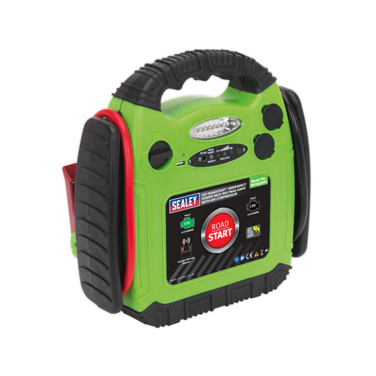 Бустер за акумулатор с компресор Sealey RS1322HV е удобен и мощен помощник при автомобилни извънредни ситуации на пътя. С неговата дължина на кабела и скобата от 0,72 м, той предоставя достатъчно гъвкавост при използване. Композитният калъф с лята гумена защита осигурява издръжливост и защита на устройството, като в същото време вграденото съхранение на кабела, батерията и дръжката за носене го правят лесен за пренасяне. LED светодиодът за състояние на батерията, проверката на полярността и звуковото предупреждение при обърната полярност осигуряват безопасност при работа. Вградената LED работна светлина позволява използване на устройството и през нощта. Вграденият въздушен компресор с манометър предоставя възможност за точно пълнене и помпене на гумите на автомобила. Двата 12V захранващи контакта могат да приемат различни 12V устройства, разполага и с USB изход (5V⎓1A) за зареждане на мобилни устройства.