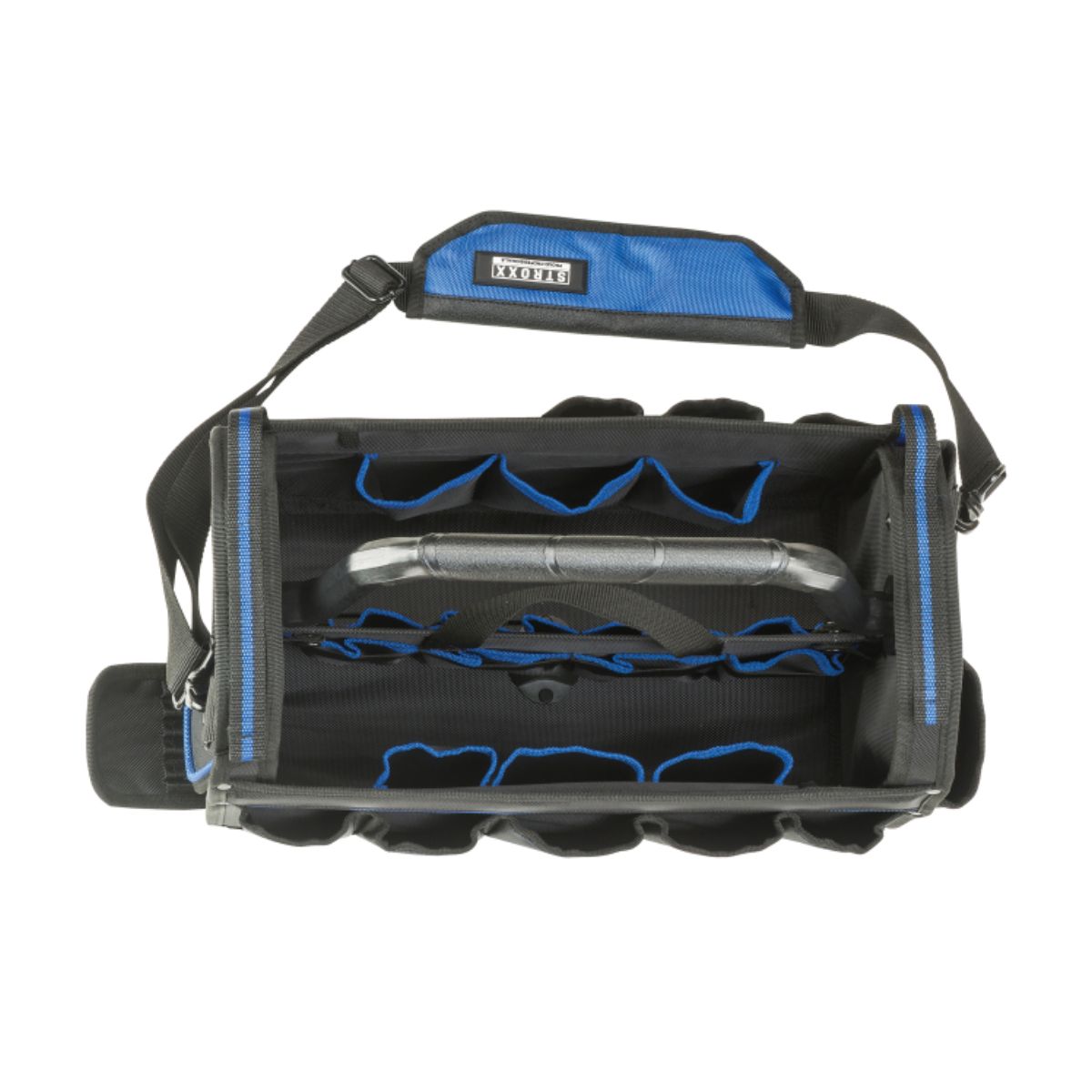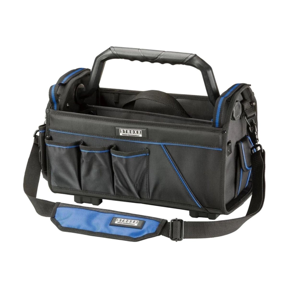 Чанта Stroxx за инструменти е перфектното решение за професионални работници да получават надежден и удобен начин за съхранение и носене на инструментите си. Със своите 19 джоба, тази чанта предлага обширен капацитет за съхранение на разнообразни инструменти, включително извънгабаритни такива, които са необходими на електротехници, водопроводчици, механици и други професионалисти, които често се налага да пътуват за работа. Създадена с внимание към издръжливостта, чантата е изработена от здрава материя, а основата с пластмасовото дъно допълват устойчивостта й. Това позволява на чантата да бъде поставяна дори на неравни повърхности, като инструментите вътре остават здраво на своите места. Въртящата се и ергономична дръжка прави преноса на чантата удобен и лесен, особено при поставяне на гърбави повърхности. За допълнително разпределение на тежестта и комфорт по време на носене, чантата разполага със здрав колан, който равномерно разпределя натоварването върху гърба на майстора. Организацията на инструментите също е улеснена благодарение на големия джоб с цип и вградения ключодържател. За специфични инструменти като триони, има специално отделение, което ги фиксира с помощта на велкро.