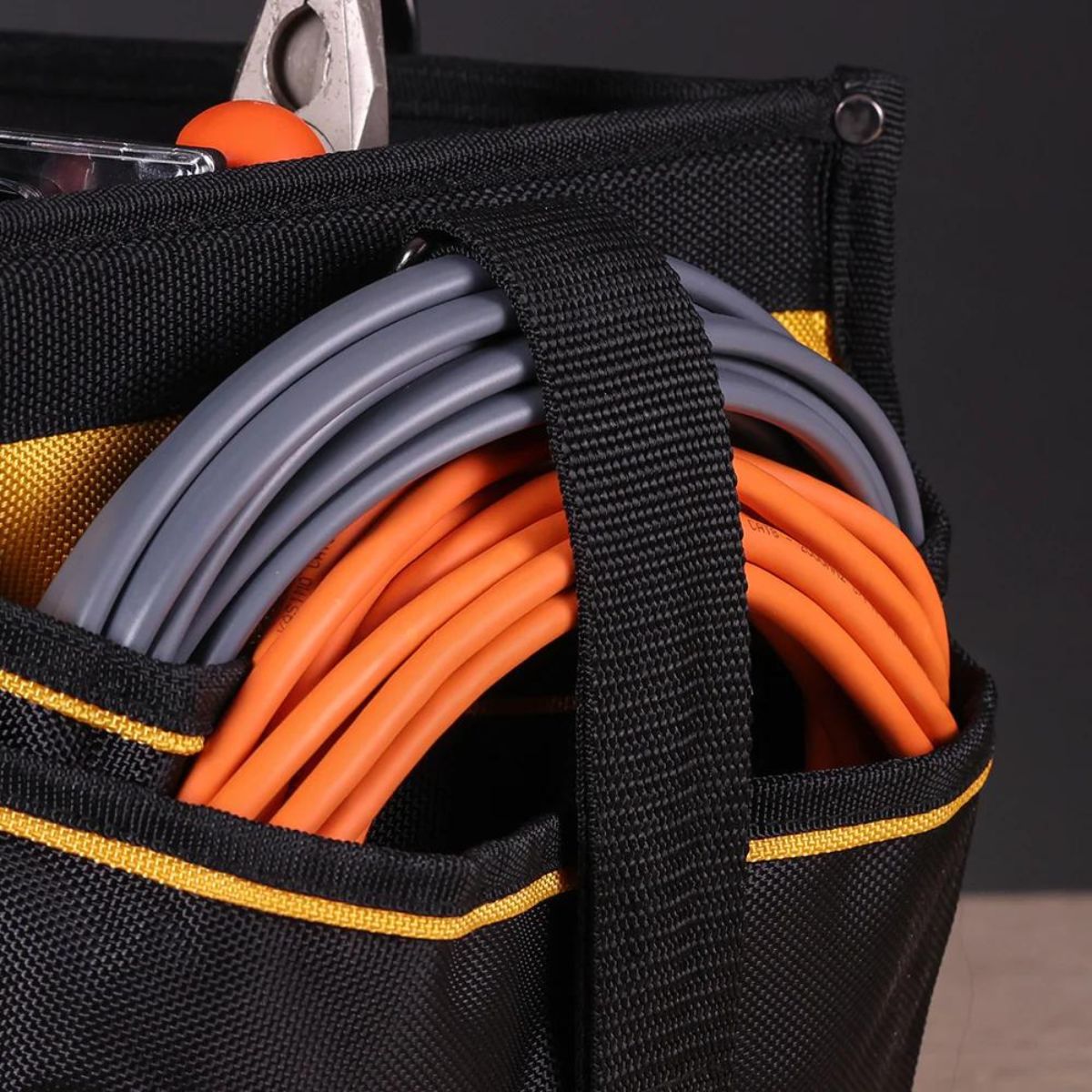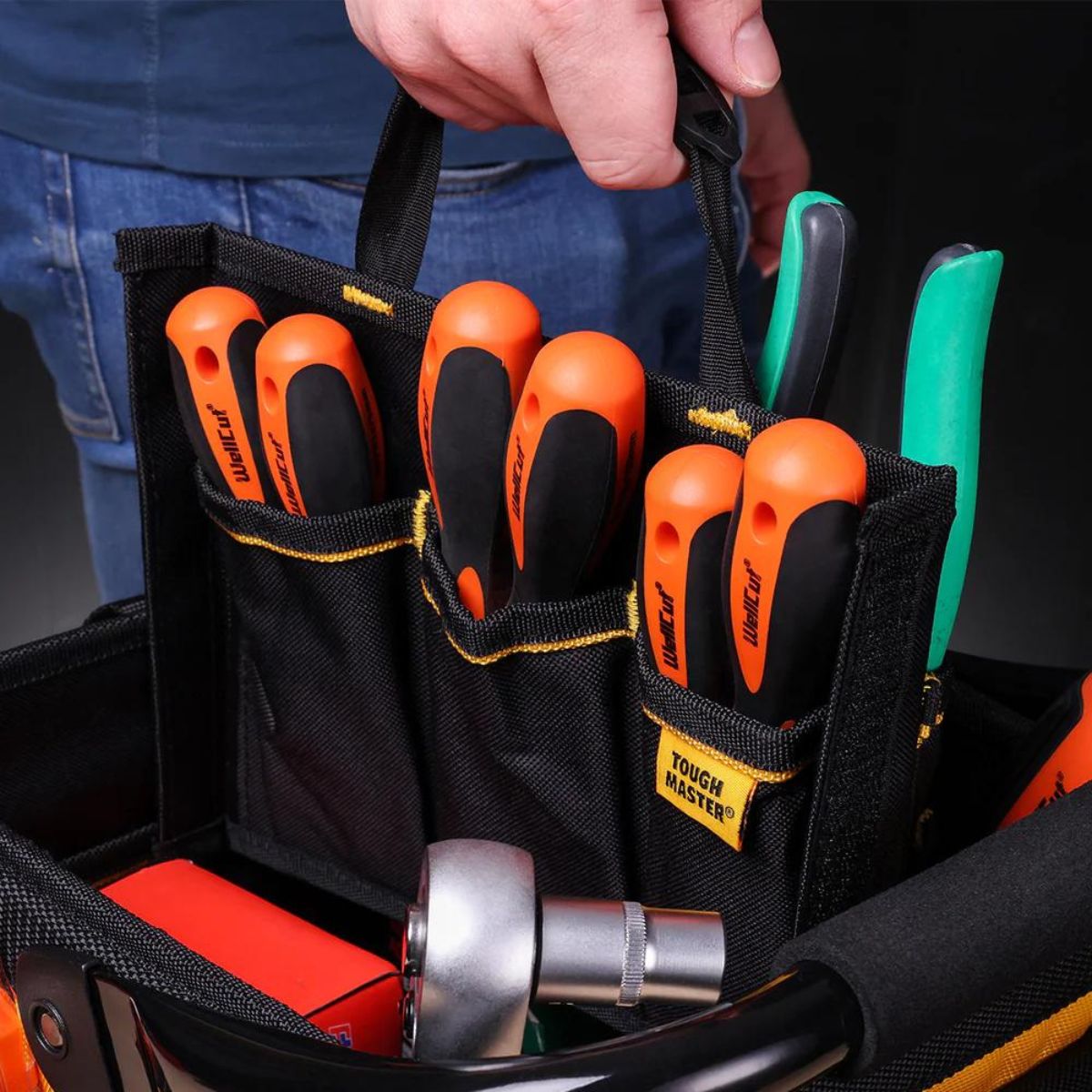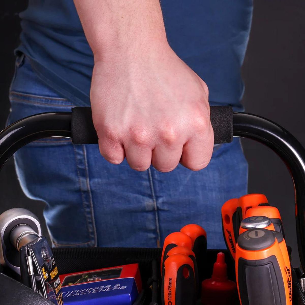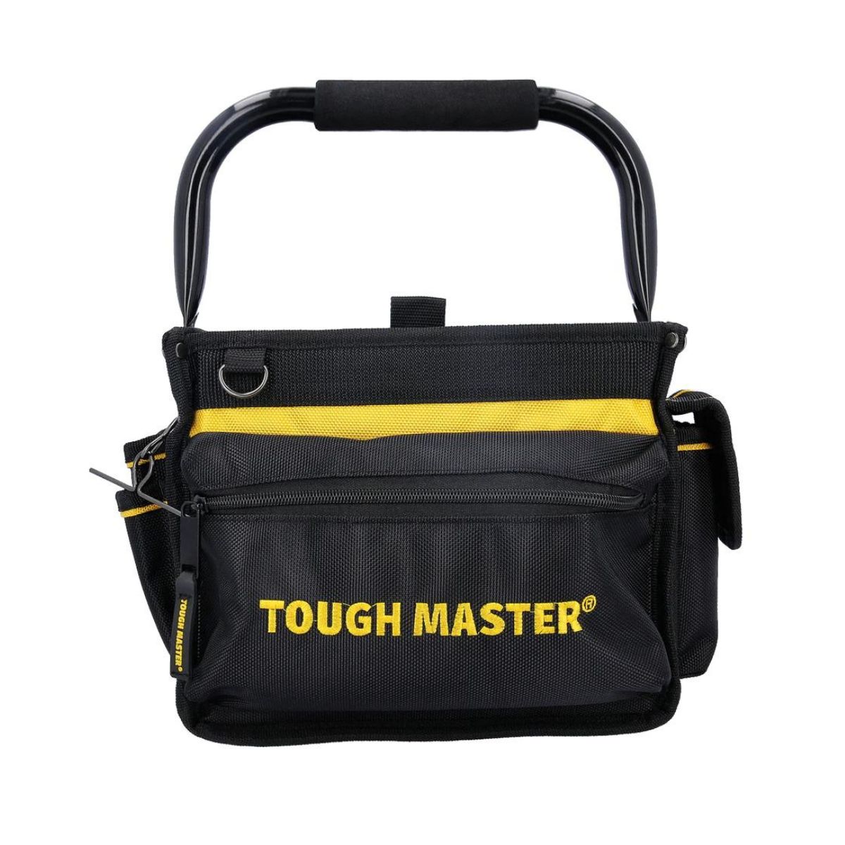 Чанта TOUGH MASTER Heavy Duty 10” е разработена с внимание към най-високите стандарти, предоставяйки ненадмината издръжливост за най-тежките задачи. Нейната здрава външна обвивка е изработена от 1680 denier полиестер, укрепена е с двойни шевове и нитове за безкомпромисна здравина. Чантата е оборудвана с пет пластмасови крачета на дъното, които осигуряват защита както за самата чанта, така и за съдържанието й, дори когато я поставите върху влажна или замърсена повърхност. Разполага с общо 19 джоба, от които девет се намират на външната част. В основното отделение има четири вътрешни джоба и 18 халки, включително подвижно място за съхранение на инструменти, което също функционира като вътрешен разделител, и разполага с още шест джоба. Тези множество джобове и халки включват и специални функционалности, като два джоба за съхранение на кабели, подплатен джоб за телефон, място за съхранение на свредла и други аксесоари. Здравата стоманена дръжка има намотана пяна за удобно носене. Има отворен дизайн, което предоставя бърз и лесен достъп до всички инструменти и аксесоари. Допълнителни функции включват външна ролкова верига с T-образна лента за съхранение на лента, място за съхранение на ролетка и D-рингове за закачане на ключове, малък фенерче и други аксесоари.