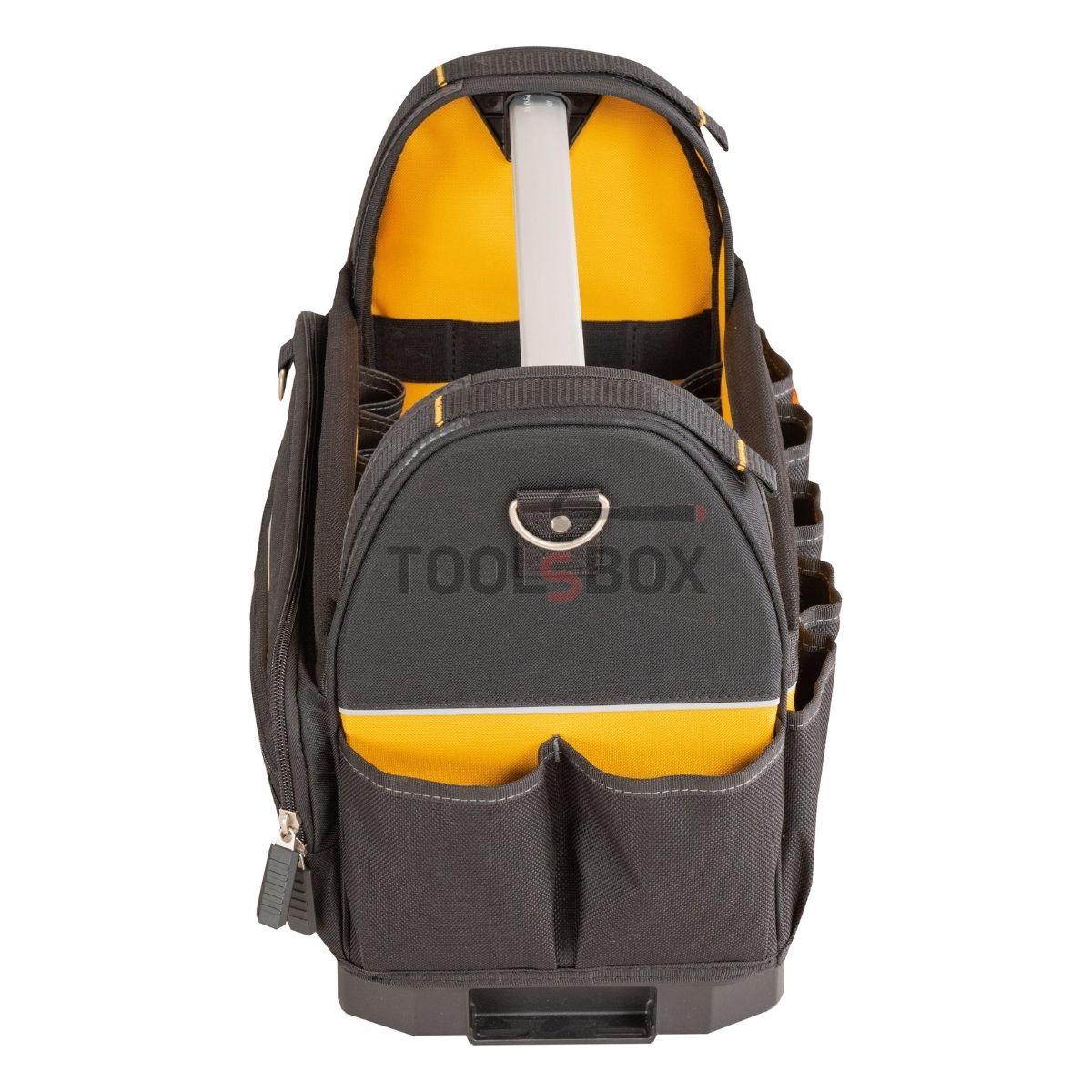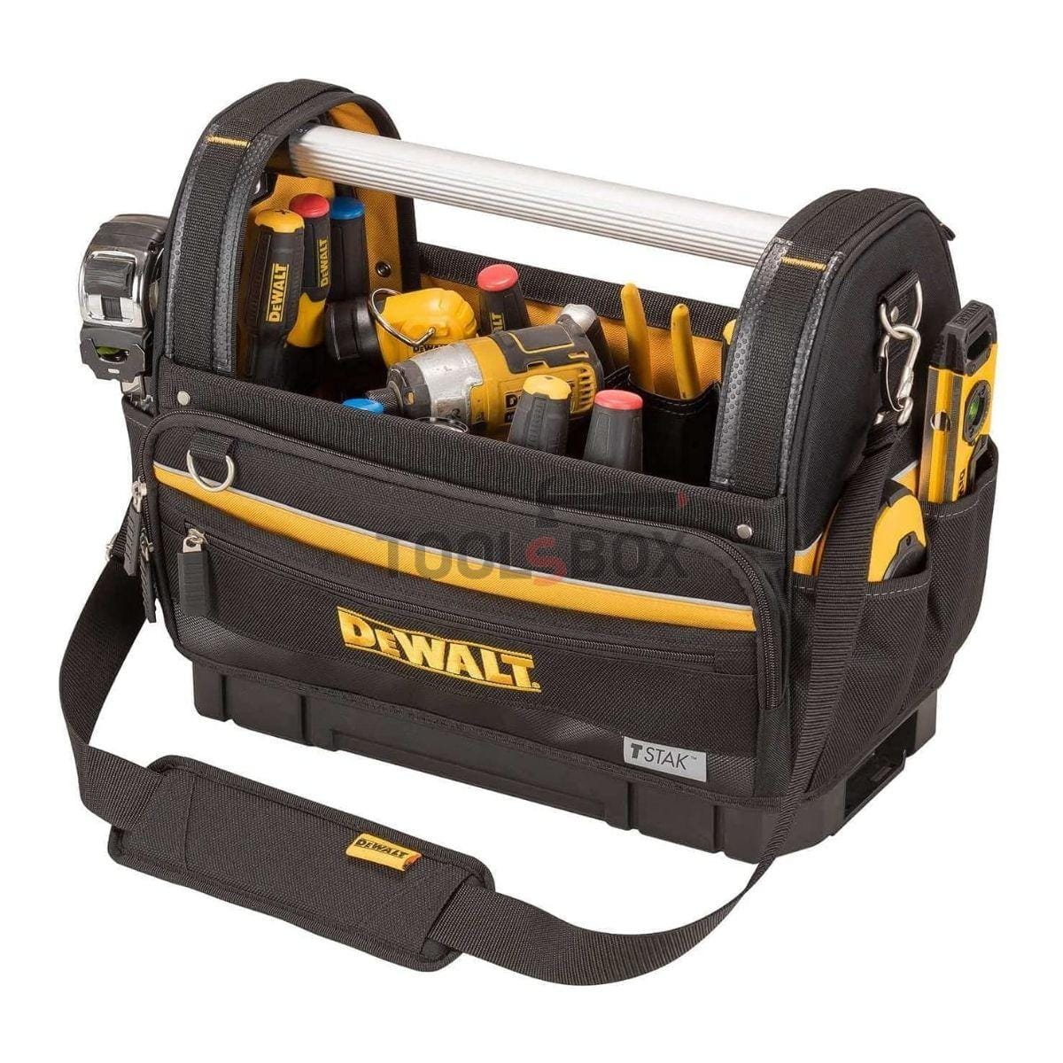 Чантата за инструменти Dewalt DWST82990 е практично решение, за човек, който цени времето си. Освен, че е лесна за пренасяне, благодарение на алуминиевата си дръжка и ергономичната подплатена презрамка за носене, долния край на чантата е направен от пластмаса, което позволява спокойното и оставяне върху мокри повърхности. Работната чанта за инструменти има много и различни отделения за оставянето на всякакви инструменти, от ножица за кабели, през накрайници за винтоверт до отвертки. Чантата за инструменти Dewalt разполага със системата TSTAK за лесно закрепване към всички останали модели, които разполагат с нея. Освен отделенията за инструменти имате и джобове с ципове, за съхранение на личните си вещи. Тази чанта разполага с голямо вътрешно пространство за обемисти инструменти и водоустойчива инжектирана пластмасова основа за защита на мокри подове. Проектиранa e с подплатена презрамка за удобно самостоятелно носене и плат (1200 denier) на външните панели за издръжливост.