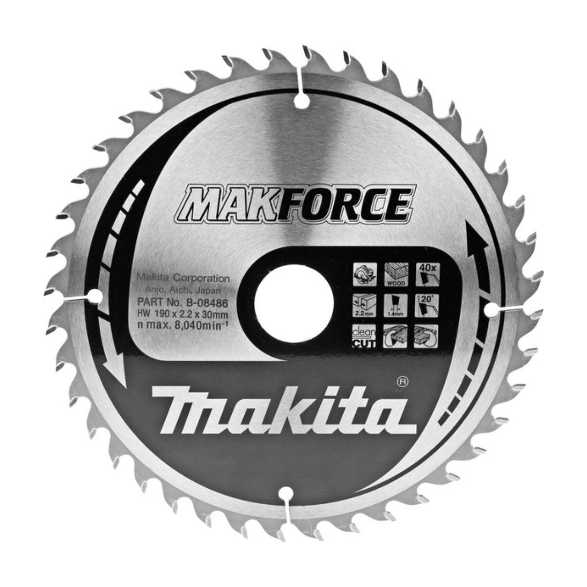 Циркулярен диск за дърво Makita B-08486 е със специално разработена геометрия на зъбите с М форма, която осигурява двойно рязане със същите зъби. С по-остри режещи ръбове и по-голяма износоустойчивост, предлага прецизно рязане без нараняване на материала. Ножът MAKForce е с 40 зъба и ще издържи до 2 х по-дълго от традиционните остриета, намалявайки триенето, което позволява по-малко налягане върху отделните зъби.