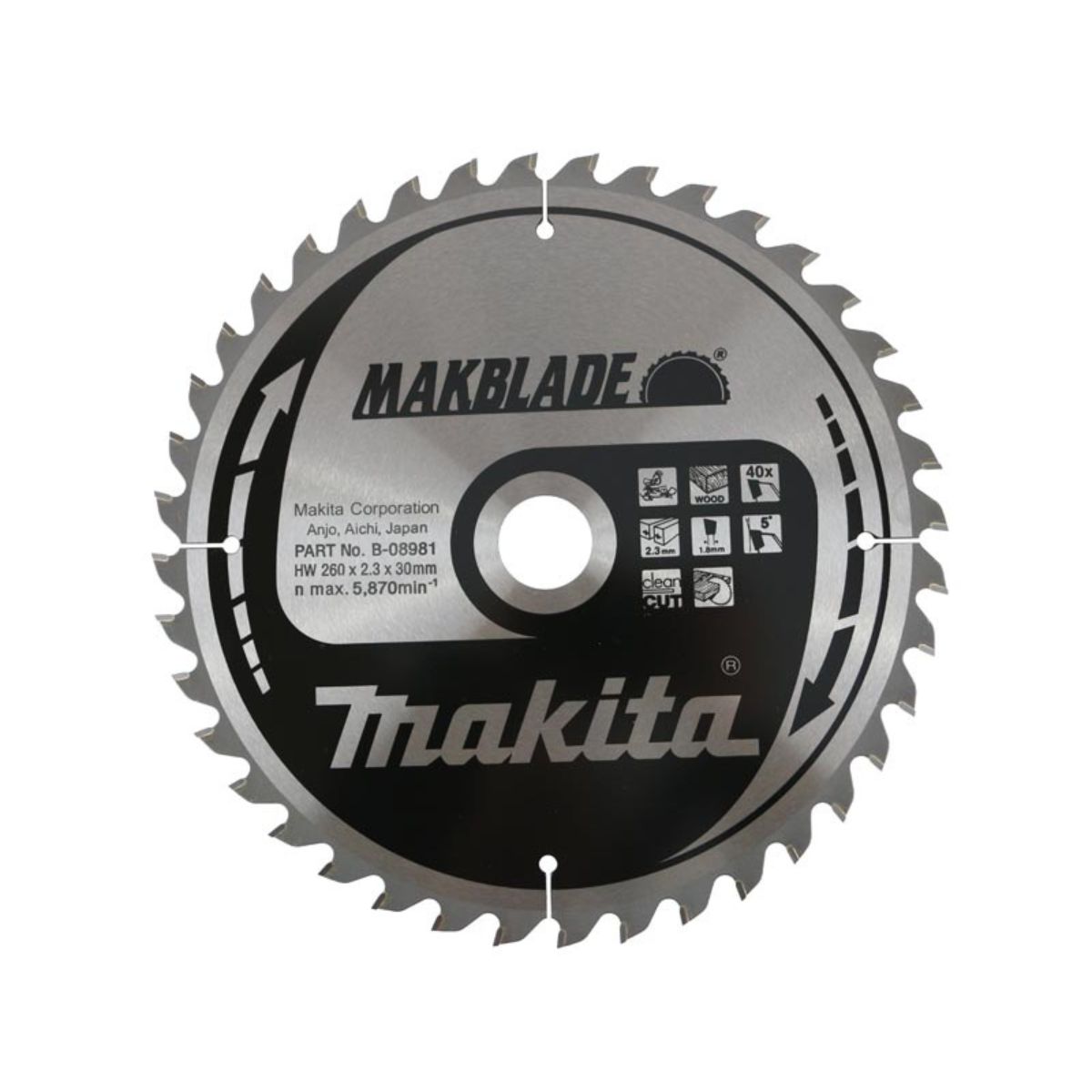 Циркулярен диск за дърво Makita B-08981 е със специално разработена геометрия на зъбите с М форма, която осигурява двойно рязане със същите зъби. С по-остри режещи ръбове и по-голяма износоустойчивост, предлага прецизно рязане без нараняване на материала. Ножът MAKBLADE е с 40 зъба и ще издържи до 2 х по-дълго от традиционните остриета, намалявайки триенето, което позволява по-малко налягане върху отделните зъби.