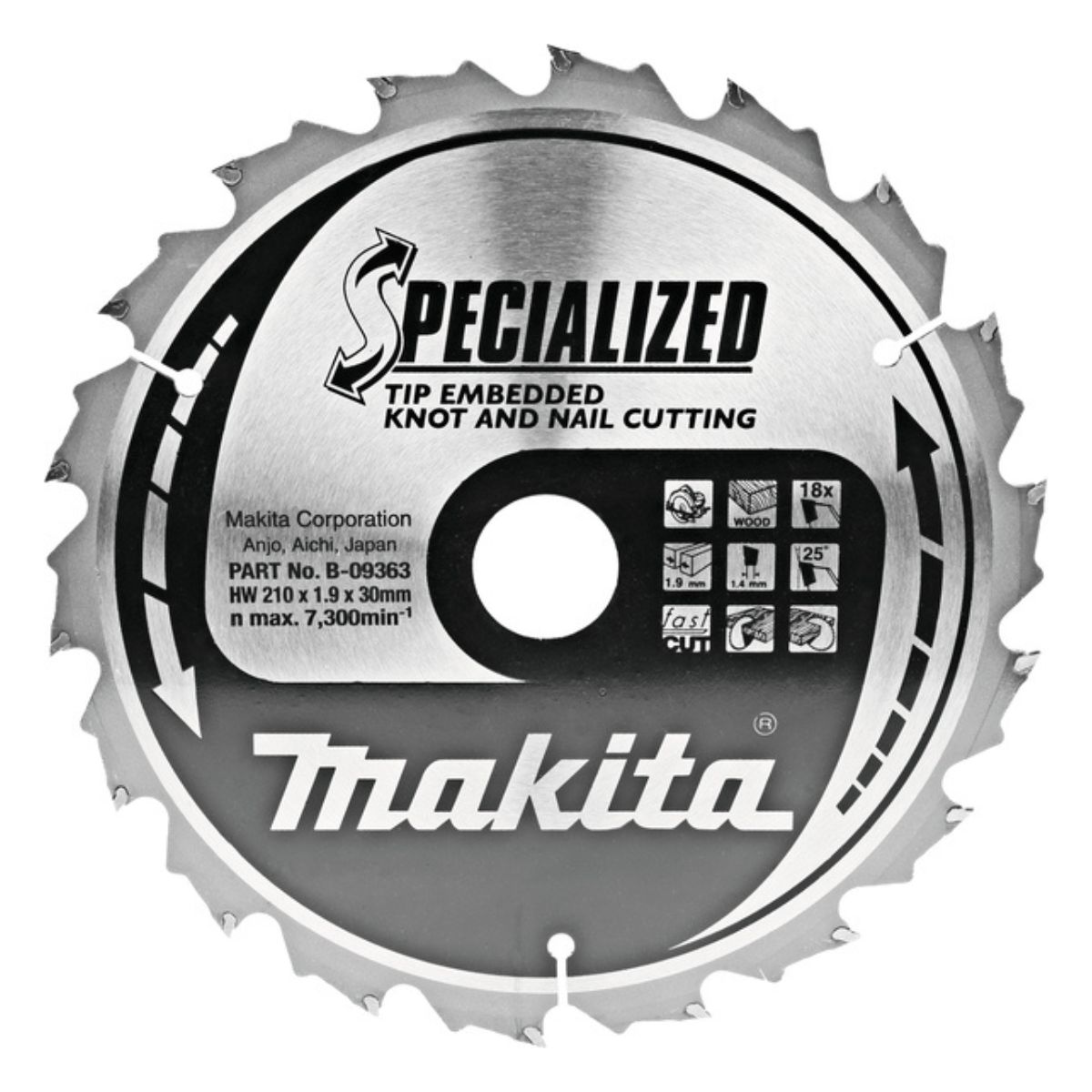 Циркулярен диск за дърво Makita B-09363 е със специално разработена геометрия на зъбите с S форма, която осигурява двойно рязане със същите зъби. С по-остри режещи ръбове и по-голяма износоустойчивост, предлага прецизно рязане без нараняване на материала. Ножът SPECIALIZED е с 18 зъба и ще издържи до 2 х по-дълго от традиционните остриета, намалявайки триенето, което позволява по-малко налягане върху отделните зъби.