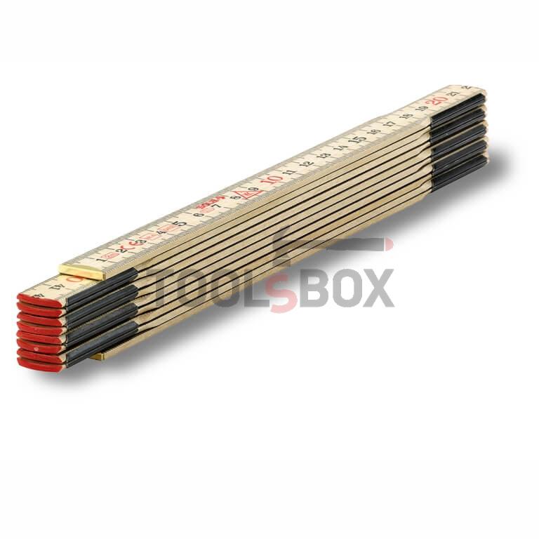 Дървен метър от еластична шведска бреза с дължина 2м, (2.4 мм дебел) двойно деление в мм и в см. Устойчив на влага и силно замърсяване благодаряние UV-защитен лак. Макс. отклонение: клас на точност III EG. Шарнири от висококачествена стомана с лаково покритие в натурален цвят. Скрити шарнири за по-добро отчитане. Приложение: за дърводелски работи и мебелното производство.