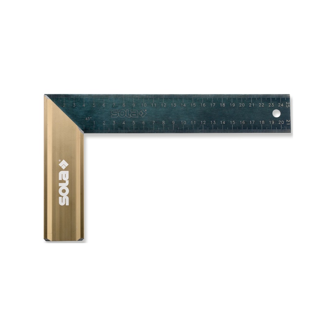 Дърводелски прав ъгъл Sola 56013001 е прецизен инструмент за точни измервания при дървообработване и монтажни дейности. Моделът разполага с рамо с размери 200 x 145 мм, изработено от закалена стомана за максимална устойчивост и дълъг живот. Дръжката е изработена от алуминий с бронзово елоксирано покритие и е гравирана от двете страни за лесно и трайно разчитане. Ъгълът позволява надеждни измервания под 45° и 90°, което го прави незаменим инструмент за професионалисти и любители в дървообработването.