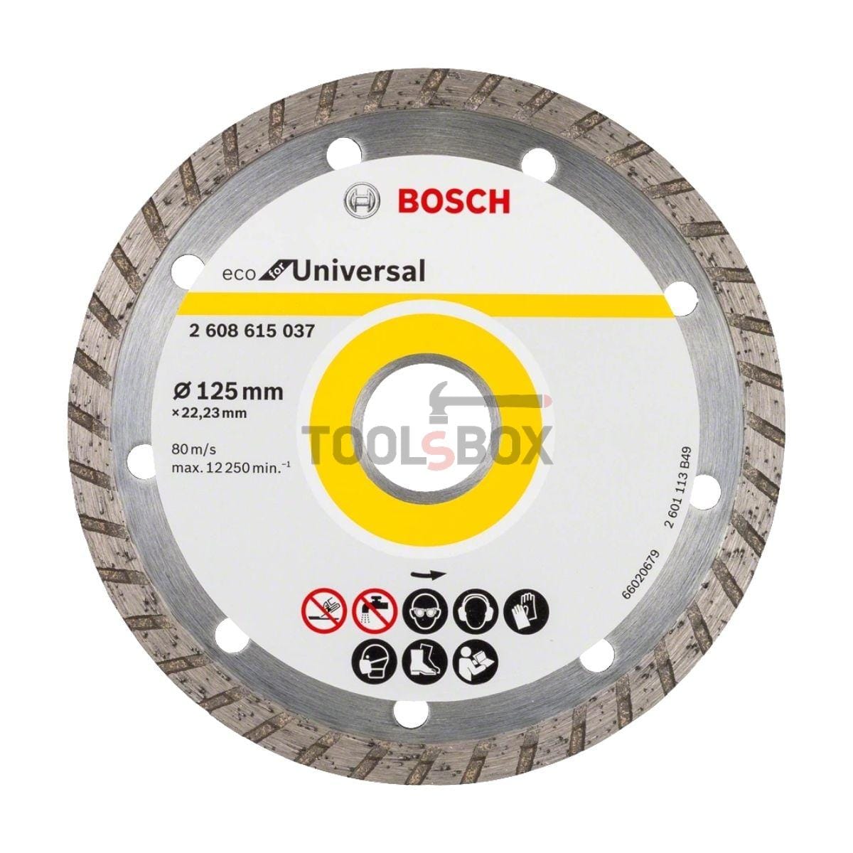 Диамантеният диск на Bosch 2608615037 Turbo ECO Universal е подходящ за сухо рязане на бетон, гранит, тухла и естествен камък. Със сегментиран режещ ръб, широчина на рязане 2.4 мм. За дълъг живот и максимална безопасност, произведен според най-високите международни стандарти за качество. Подходящ за ъглошлайфи с дискове 125 мм от всички марки електроинструменти.