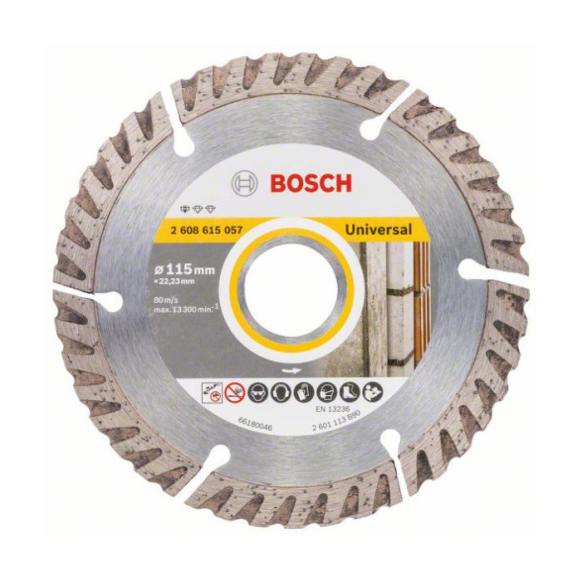 Диамантен диск Bosch 2608615057 Standart For Universal осигурява надеждни срезове в универсални строителни материали. Оптимизираната диамантена матрица осигурява добри резултати, благодарение на висококачествените стандарти на диска. Подходящ за сухо рязане на бетон, гранит, тухла и естествен камък. Със сегментиран режещ ръб, широчина на рязане 2 мм. За дълъг живот и максимална безопасност, произведен според най-високите международни стандарти за качество. Подходящ за ъглошлайфи с дискове 115 мм от всички марки електроинструменти.