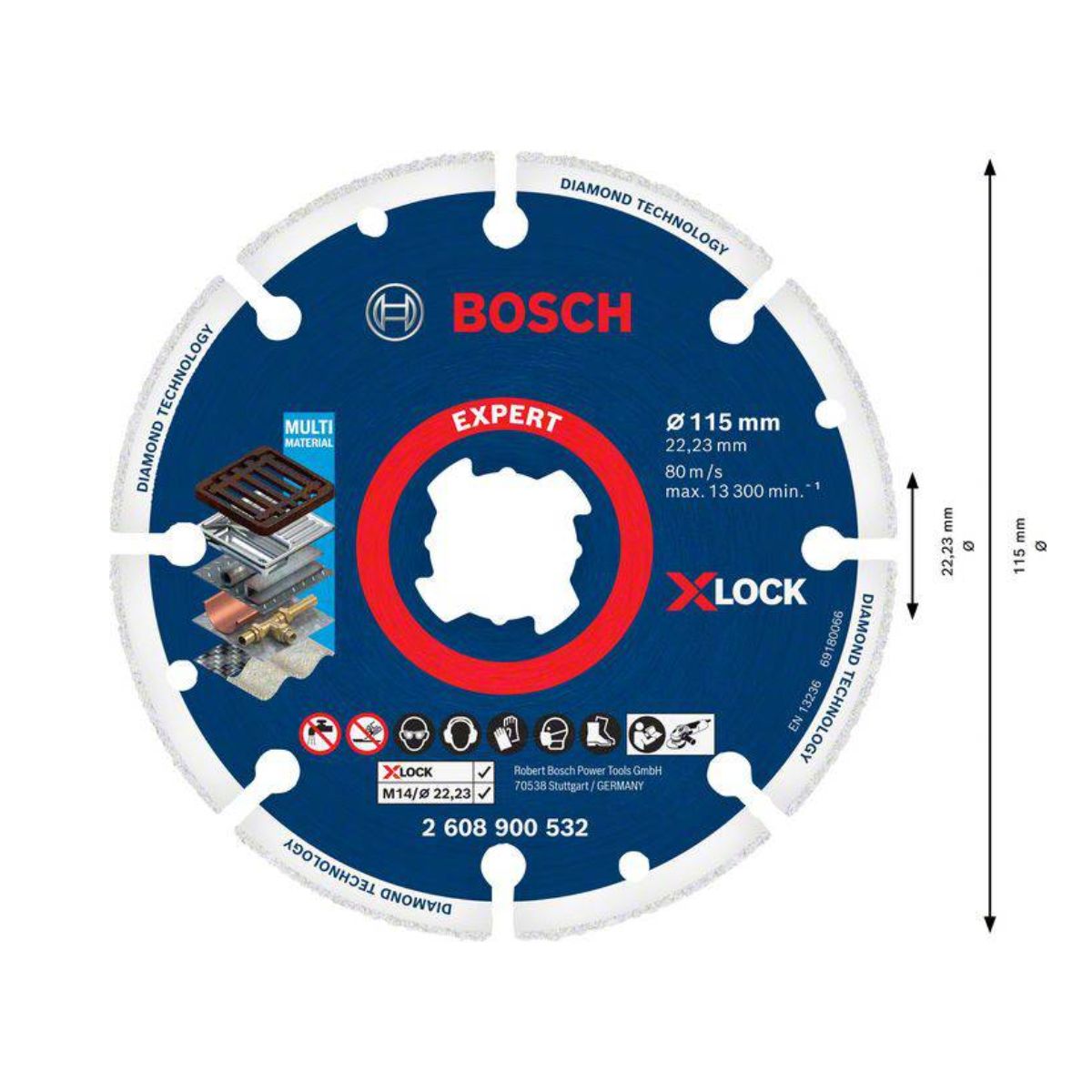 Диамантен диск Bosch X-Lock 2608900532 е изработен от стоманено тяло и висококачествен диамантен ръб, който гарантира висока устойчивост и ефективност. Благодарение на диамантената технология, той е изключително издръжлив на счупване, не създава допълнителен прах по врме на работа и няма химическа миризма, което допринася за комфорта на оператора. Разполага с безключова система X-LOCK за смяна на инструментите, което осигурява бърза и лесна смяна. Можете да постигнете прецизни срезове напълно безопасно, тъй като дискът отговаря на най-високите изисквания за безопасност, а именно EN 13236.