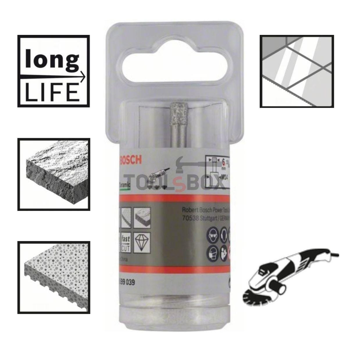 Свредлото Bosch 2608599039 е част от гамата Bosch Dry Speed Best for Ceramic е предназначена за сухо пробиване на керамични, фаянсови плочки, гранит и др. Диамантеното свредло е с висококачествена изработка с дълъг експлоатационен живот. Пробиване без удар с оптимални обороти 1500 в минута. Предназначено за употреба с ъглошлайф. Този модел се отличава с вакуумно споени диаманти, което го прави изключително устойчив и дълготраен за редица приложения. Интегрираното съхранение на охлаждащата течност позволява плавна работа.