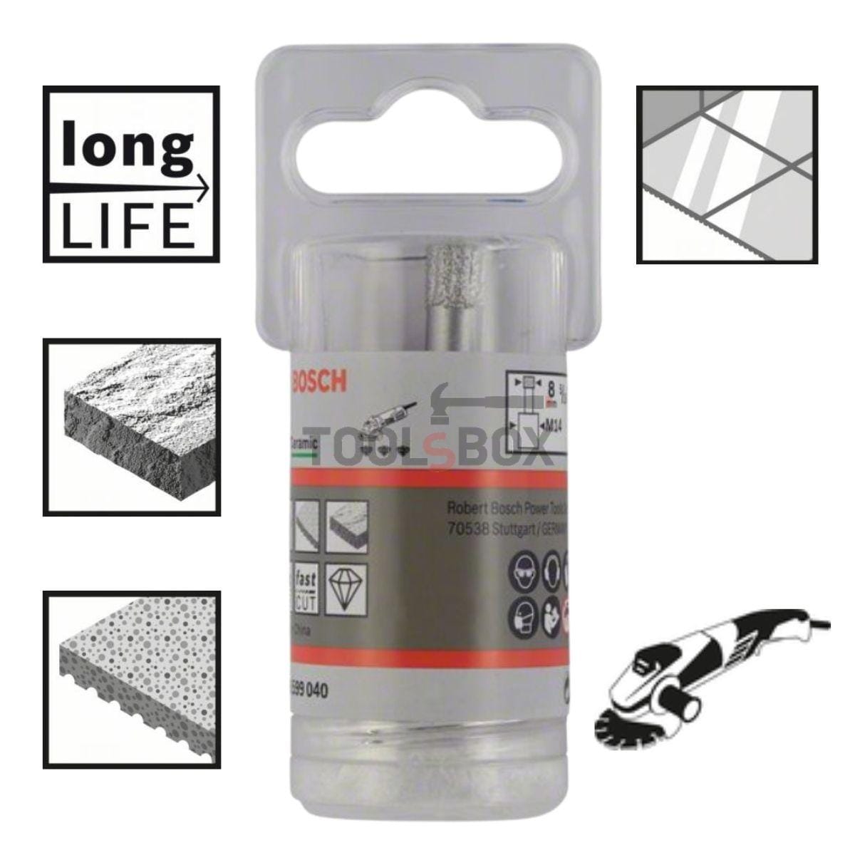 Свредлото Bosch 2608599040 е част от гамата Bosch Dry Speed Best for Ceramic е предназначена за сухо пробиване на керамични, фаянсови плочки, гранит и др. Диамантеното свредло е с висококачествена изработка с дълъг експлоатационен живот. Пробиване без удар с оптимални обороти 1500 в минута. Предназначено за употреба с ъглошлайф. Този модел се отличава с вакуумно споени диаманти, което го прави изключително устойчив и дълготраен за редица приложения. Интегрираното съхранение на охлаждащата течност позволява плавна работа.