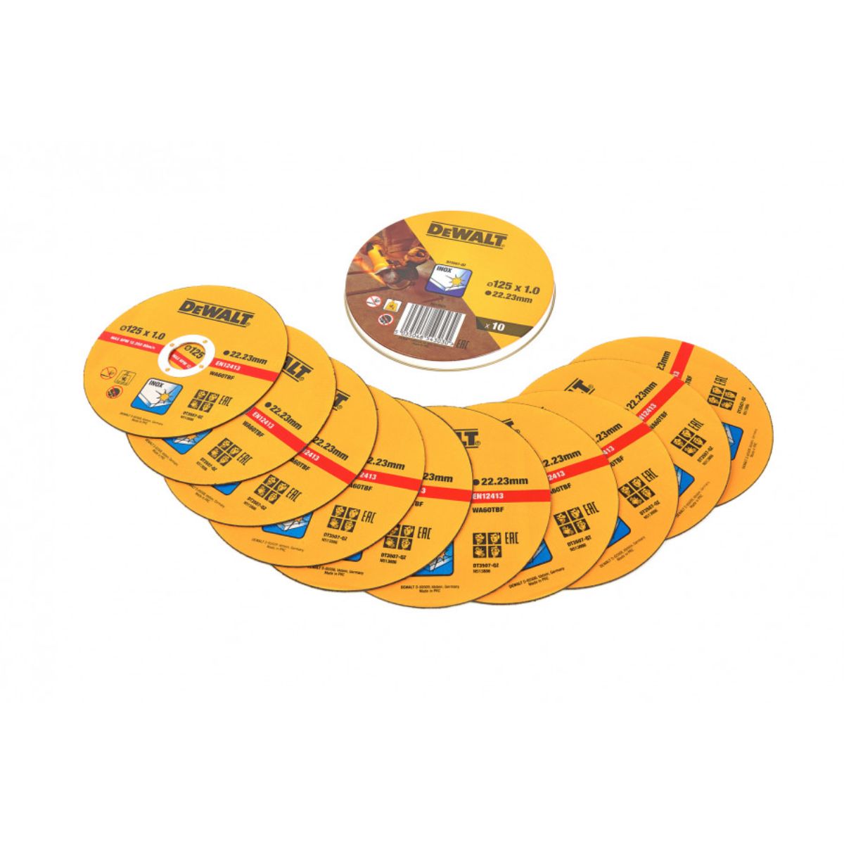 Дисковете DeWalt DT3507-QZ за бързо рязане са подходящи за рязане на неръждаема стомана INOX. Състои се от формулировка от алуминиев оксид високо качество и подсилено фибростъкло, като основата е свръх качествен. С Dewalt DT3507 се постига бърз и точен резултат, оставяйки потребителя удовлетворен във всички случаи. Този продукт увеличава гъвкавостта на работата. При покупка на 10бр получавате метална кутийка за съхранение.