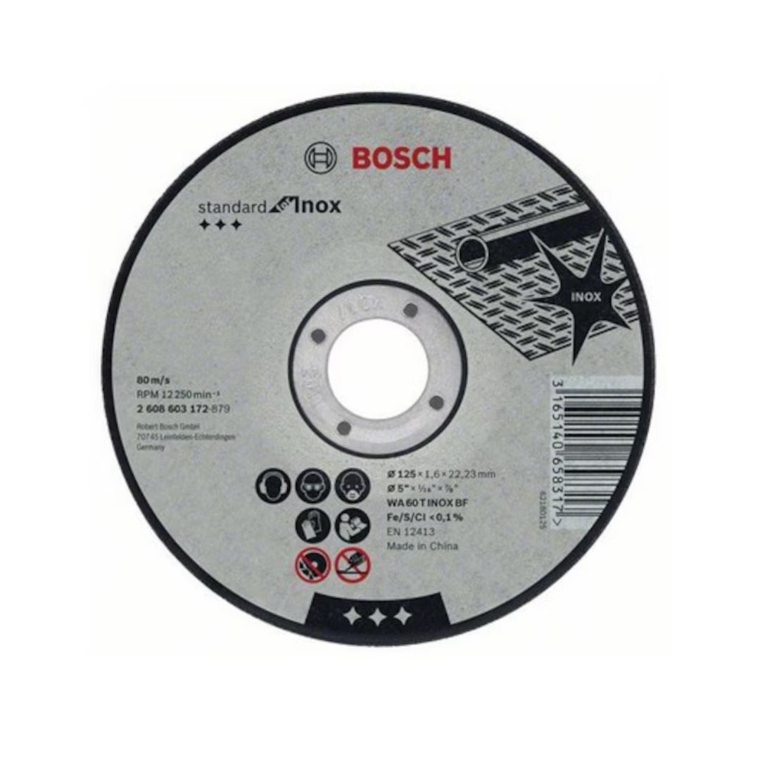 Диск за рязане на неръждаема стомана и метал Bosch 2608603172 е специално проектиран за рязане на неръждаема стомана и метал. Изработен е от премиум абразивни зърна от алуминиев оксид с добавки, които намаляват натрупването на топлина по време на работа. Дискът е подсилен с висококачествена тъкан от фибростъкло за повишена безопасност. Не съдържа желязо, което предотвратява появата на ръжда върху обработваните детайли при рязане на инокс.