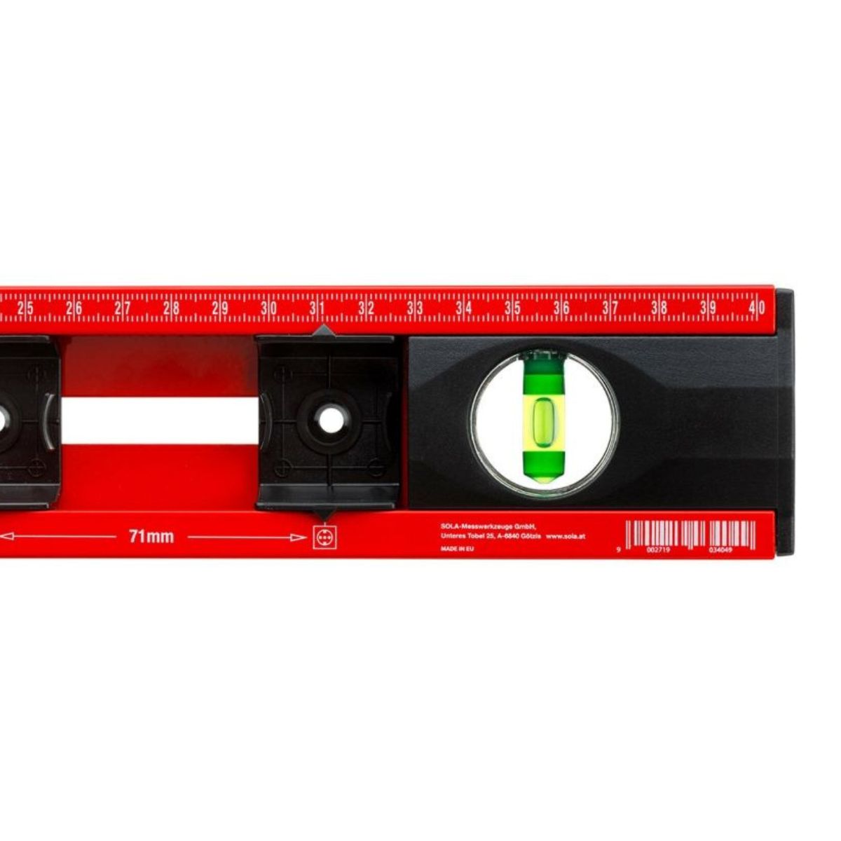 Електричарски алуминиев нивелир Sola Electric е висококачествен инструмент с дължина от 41 см. Той предлага висока точност на измерване както в стандартно, така и в обърнато положение. Нивелирът разполага със стабилен алуминиев профил, който осигурява здравина и устойчивост, както и гъвкави маркери за удобство при работа. За по-добро, бързо и точно отчитане на измерванията, нивелирът е оборудван с патентовани либели SOLA FOCUS. Скалата на нивелира е гравирана с прецизни маркировки на всеки 1 мм. Особено полезна е специалната електротехническа скала, която позволява четири маркировки на стандартно разстояние от 71 мм съгласно DIN 49075. Нивелирът разполага с пластмасови разделители, които предотвратяват плъзгането при маркиране и гарантират прецизност при работа.