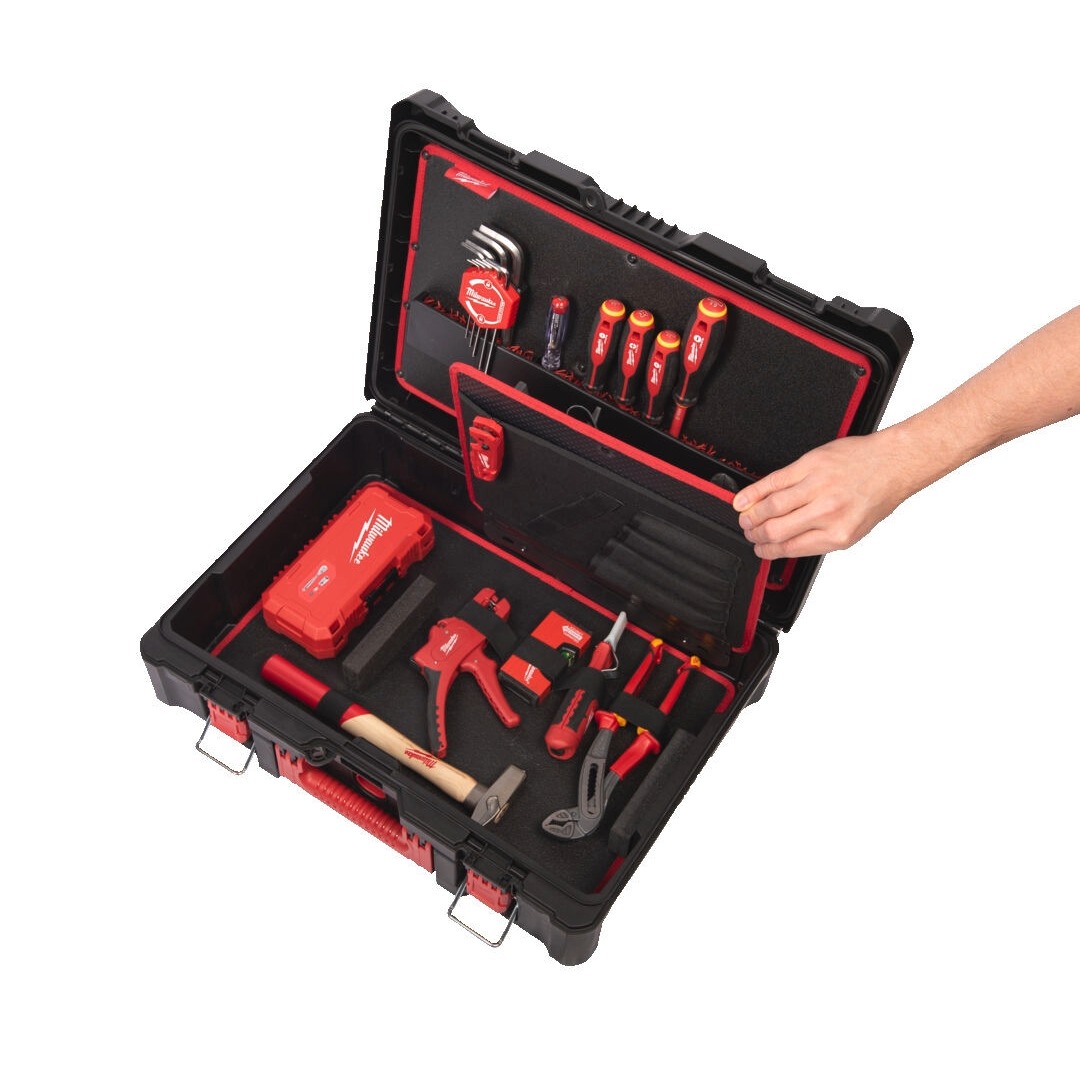 Електричарски куфар Milwaukee 4932499703 е създаден за сигурно съхранение и удобно транспортиране на ръчни инструменти в професионална среда. Напълно съвместим с модулната система PACKOUT™, той се интегрира лесно в съществуващата конфигурация за съхранение. Здравата, удароустойчива конструкция предпазва съдържанието при работа в тежки условия, а добре обмисленият вътрешен дизайн осигурява бърз достъп и отлична организация. Благодарение на множеството разделители куфарът позволява гъвкава и практически неограничена конфигурация според конкретните инструменти и нужди, което го прави надеждно и практично решение за всеки електротехник.