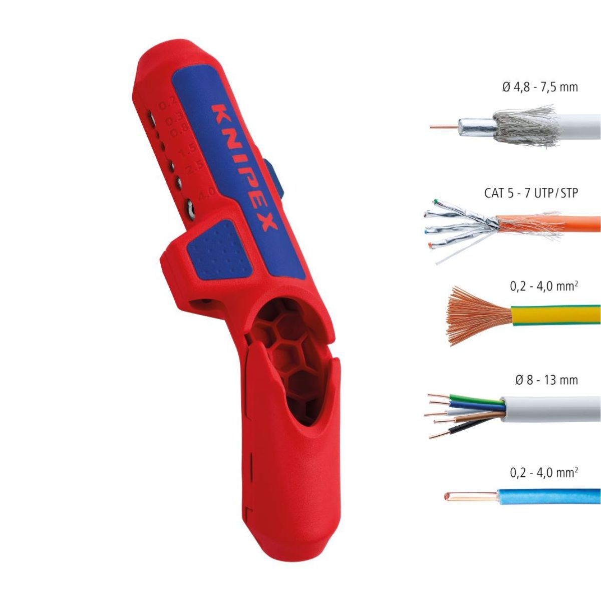Електротехнически инструмент Knipex 16 95 01 SB е предназначен за удобно и ефективно обработване на различни стандартни кабели, включително кръгли кабели като NYM (3 x 1,5 mm² до 5 x 2,5 mm²), кабели за данни (например, Twisted-двойки) и коаксиални кабели. Този иновативен инструмент разполага с ергономична револверна ръкохватка, която е конструирана за лесно отрязване, издърпване и надлъжно рязане на облицовката на кабелите. Изтънените конично краища на инструмента осигуряват по-добра достъпност. Разполага с приспособление за сваляне на изолация, което е подходящо за сечения от 0,2 до 4 mm². Лесното поставяне на отделните проводници за сваляне на изолацията се осъществява благодарение на ограничителните отметки. Комфортното поставяне на коаксиални кабели и кабели за данни се постига чрез специално приспособление за отваряне. Инструментът разполага с многокомпонентна конструкция, която включва зона за комфортно хващане и манипулация, осигурявайки удобство и контрол по време на работа. Тялото на инструмента е изработено от устойчива пластмаса, усилена със стъкловлакна, което гарантира дълготрайност и надеждност при употреба в различни условия.