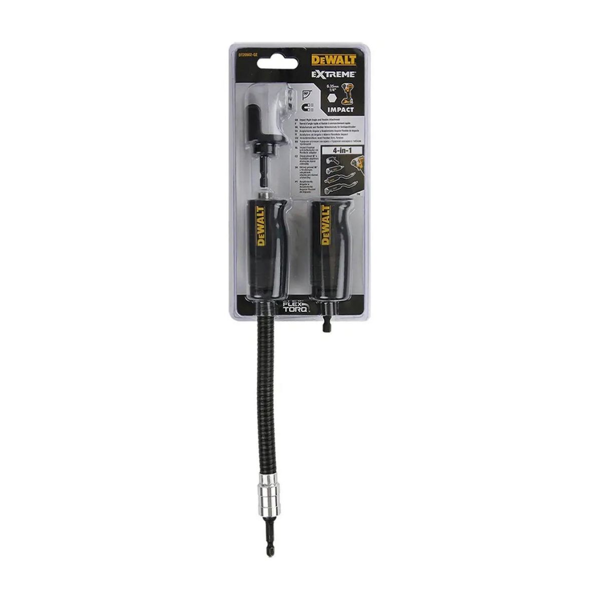 Гъвкав ъглов удължител с магнитен накрайник DeWALT DT20502 е висококачествена 4 в 1 приставка, която включва модулна приставка, гъвкав вал под прав ъгъл, осем ъгъл и прав гъвкав вал. Той е създаден, за да улесни работата при завинтване и пробиане във всякакви неудобни ъгли. Разполага с метална скоростна кутия, която да издържи на най-мощните модели ударни винтоверти, а малкото му тяло от 38мм дава възможност да достигнете до тесните пространства лесно и удобно.