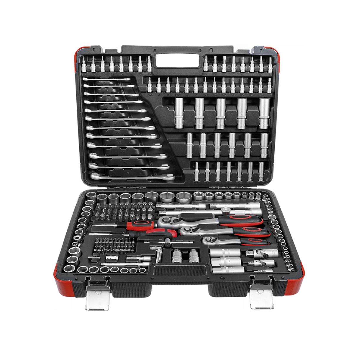 • 3 тресчотки: 2x 45T: 1/2″ х 250 мм и 3/8″ х 210 мм, и 1x 72Т: 1/4″ х 155 мм;