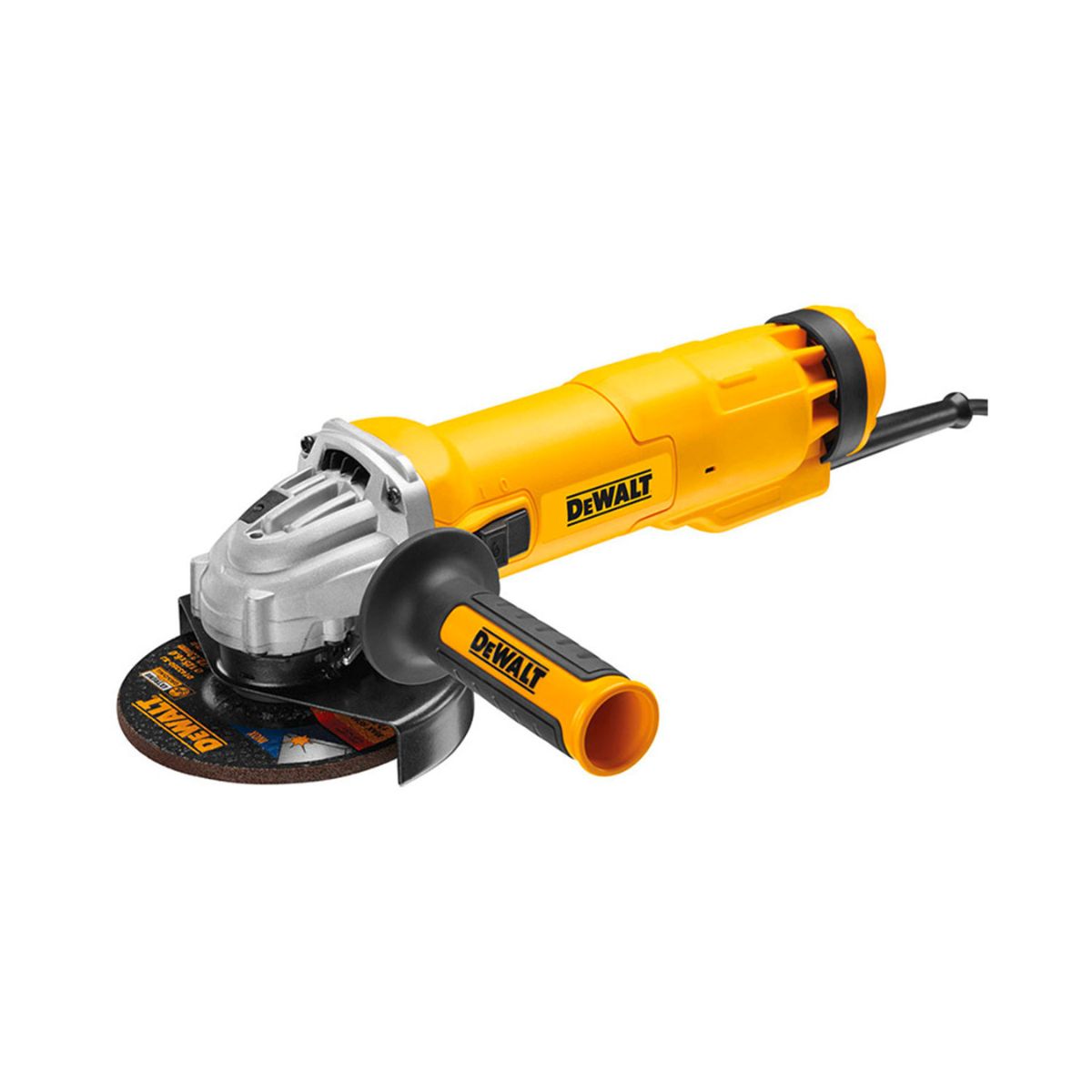 Електрически ъглошлайф DeWALT DWE4207 предлага удобен и компактен корпус, идеален за професионалния майстор, който извършва различни видове работа като рязане, шлайфане и полиране на работни детайли и цели изделия. Използва се за обработка на разнообразни материали като метал, дърво, пластмаса, камък и други. Ъглошлайфът разполага с малка обиколка, която осигурява удобство на захвата и идеална ергономичност по време на работа. Корпусът е със защита от абразивен прах и директно изведени статорни намотки, което осигурява по-добра безопасност и надеждност. Конструкцията на четка / четкодържача предотвратява вдигането на четката от ротора при екстремни натоварвания. Антивибрационната странична дръжка осигурява по-голям комфорт по време на работа. Системата за изхвърляне на праха отстранява голяма част от засмуквания във вътрешността на ъглошлайфа, осигурявайки по-чист въздух през двигателя. Специалната конструкция с антиблокировка на фланеца предпазва режещия диск от заклинване, подобрявайки общата работа и ефективност на инструмента.