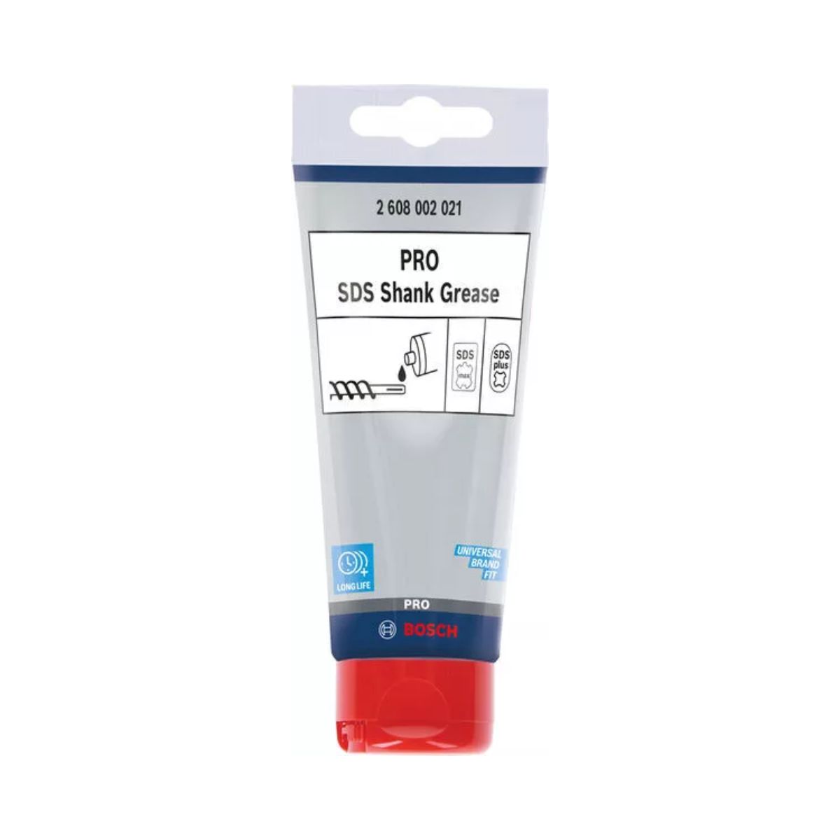Bosch 2608002021 е грес, предназначена за свредла и шила, с антикорозионни и консервационни свойства, устойчива на вода. Предназначена е за инструменти, които се експлоатират с високи ударни натоварвания и вибрации. Нанася се на опашката на работния инструмент преди поставянето му в патронника. Разфасовка 100 мл.
