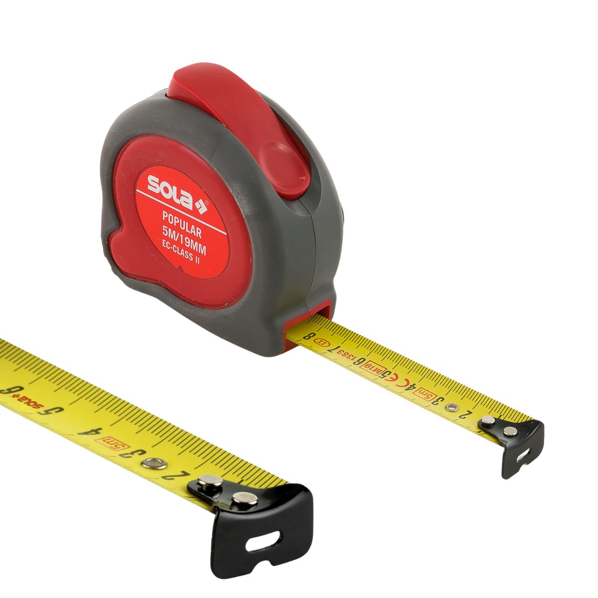 Гумирана ролетка Sola Popular PP 5 м е надежден инструмент и е изработен от удароустойчива двукомпонентна пластмаса, съчетаваща ABS и TPE термопласт, което осигурява здравина и издръжливост на инструмента. Гумираната противоплъзгаща повърхност и ергономичният дизайн гарантират безопасна работа и удобен захват. Лентата на ролетката е изработена от стомана с жълто, матово лакирано покритие, което осигурява ясна видимост и издръжливост. Ролетката разполага с прецизен стопиращ механизъм на лентата от 2 части, който позволява точни вътрешни измервания. Системата на амортисьорите гарантира внимателно и контролирано стопиране на лентата. Клипсът за колана е здрав и изработен от ABS термопласт, осигуряващ по-голяма устойчивост и сигурно закрепване на ролетката към колана. Ролетката отговаря на клас II точност съгласно директивата на ЕО, което гарантира нейната прецизност и надеждност при измерванията.